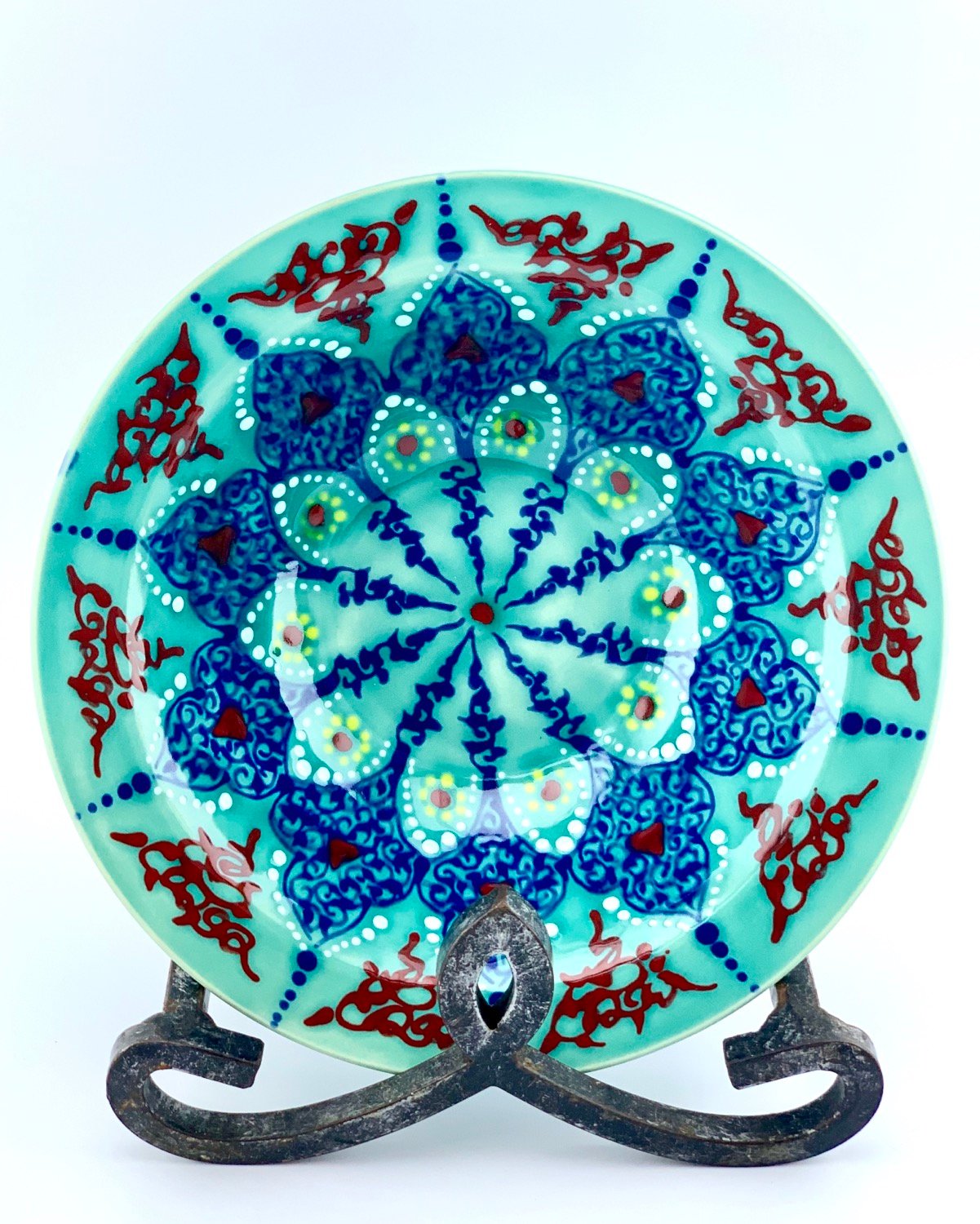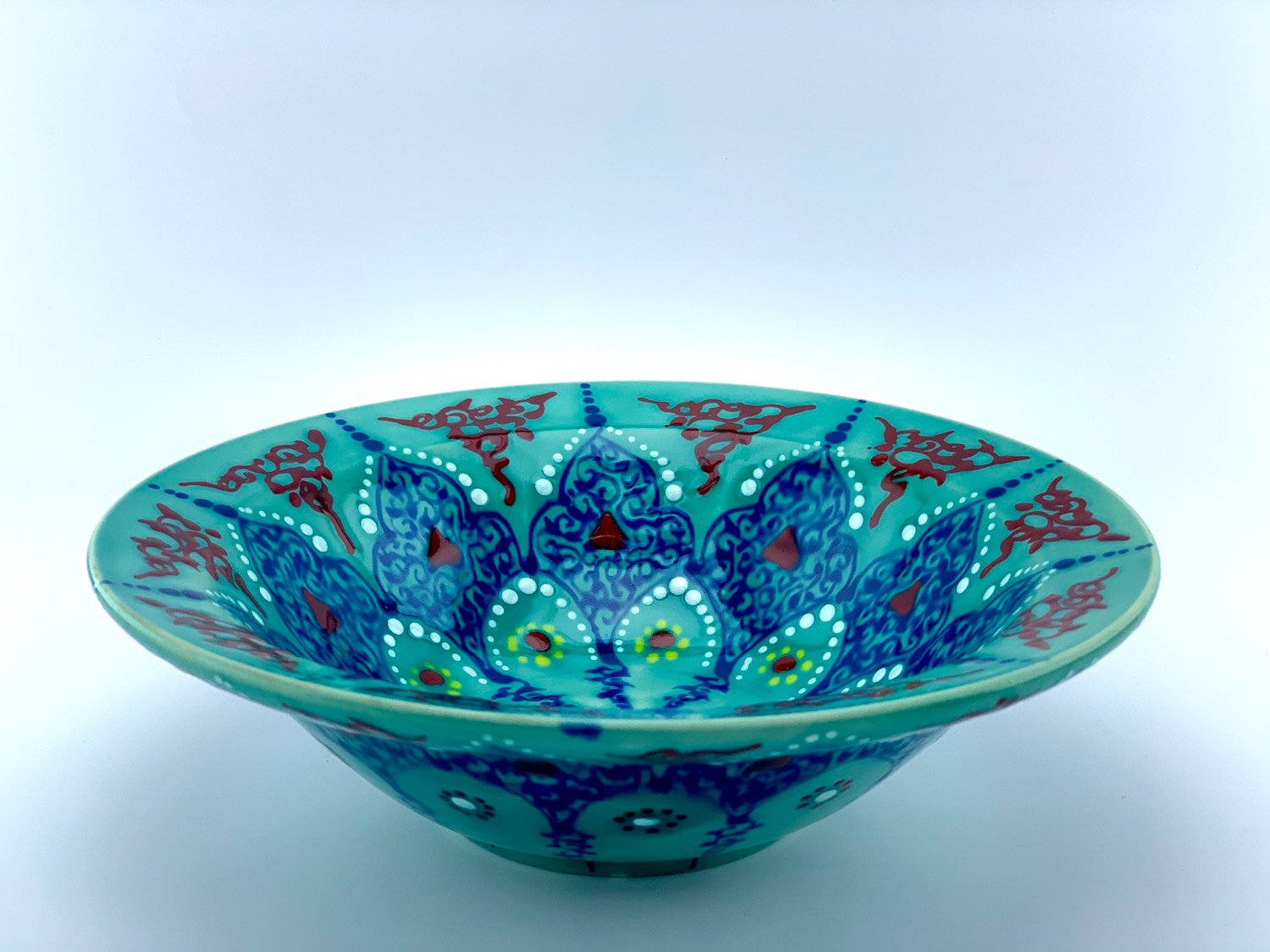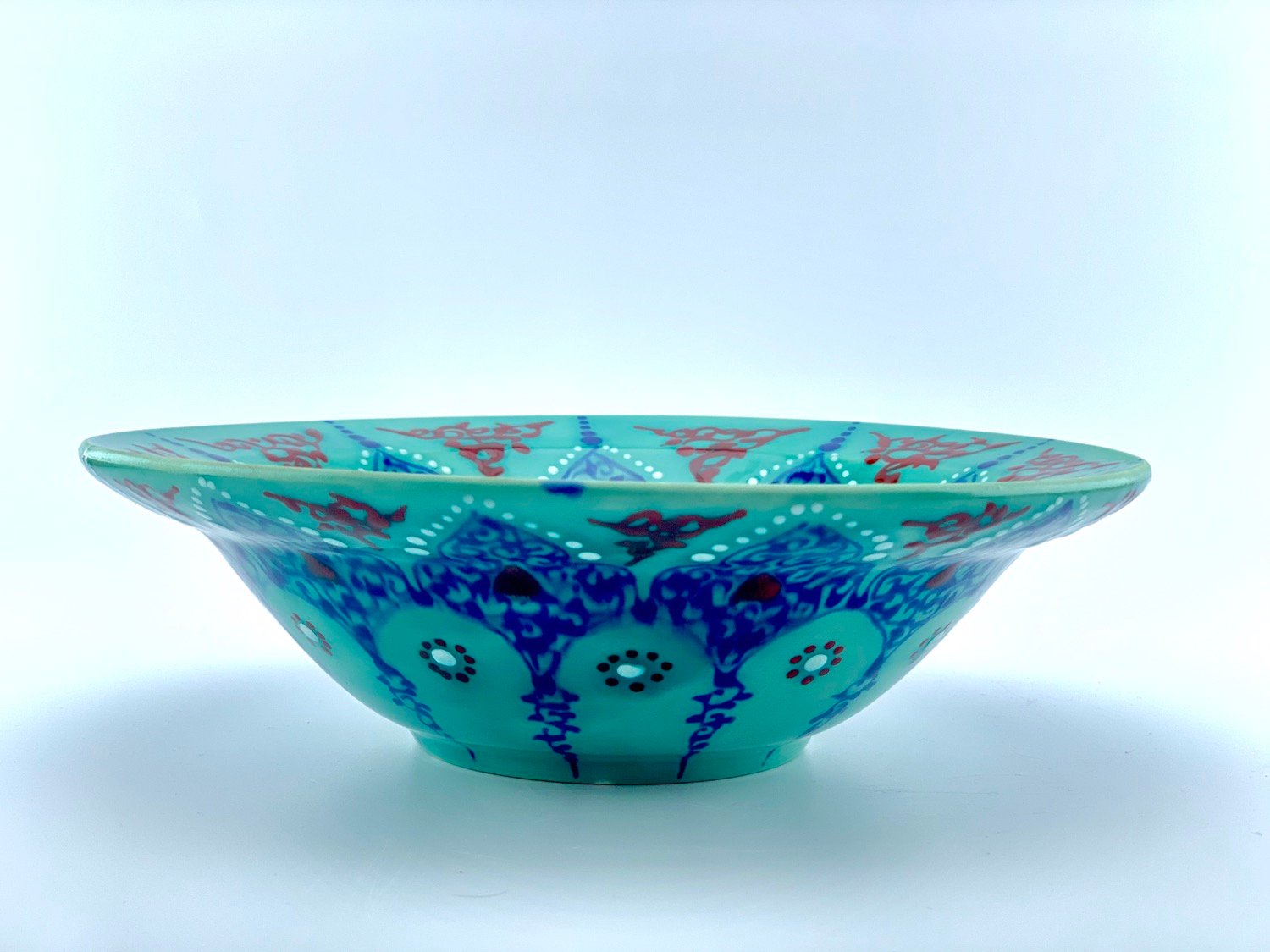 Hand painted and glazed bowl in turquoise traditional designs . it would be a masterpiece on your dining table or inside your cabinets. It will bring smile on your face.dishwasher and microviwe safe ,8¾” Dia. x 2½” H (19 Ounces)