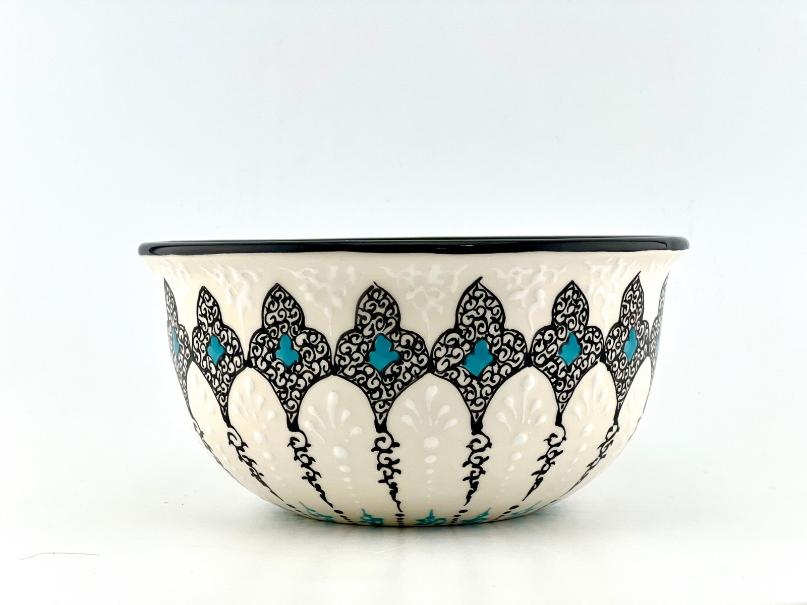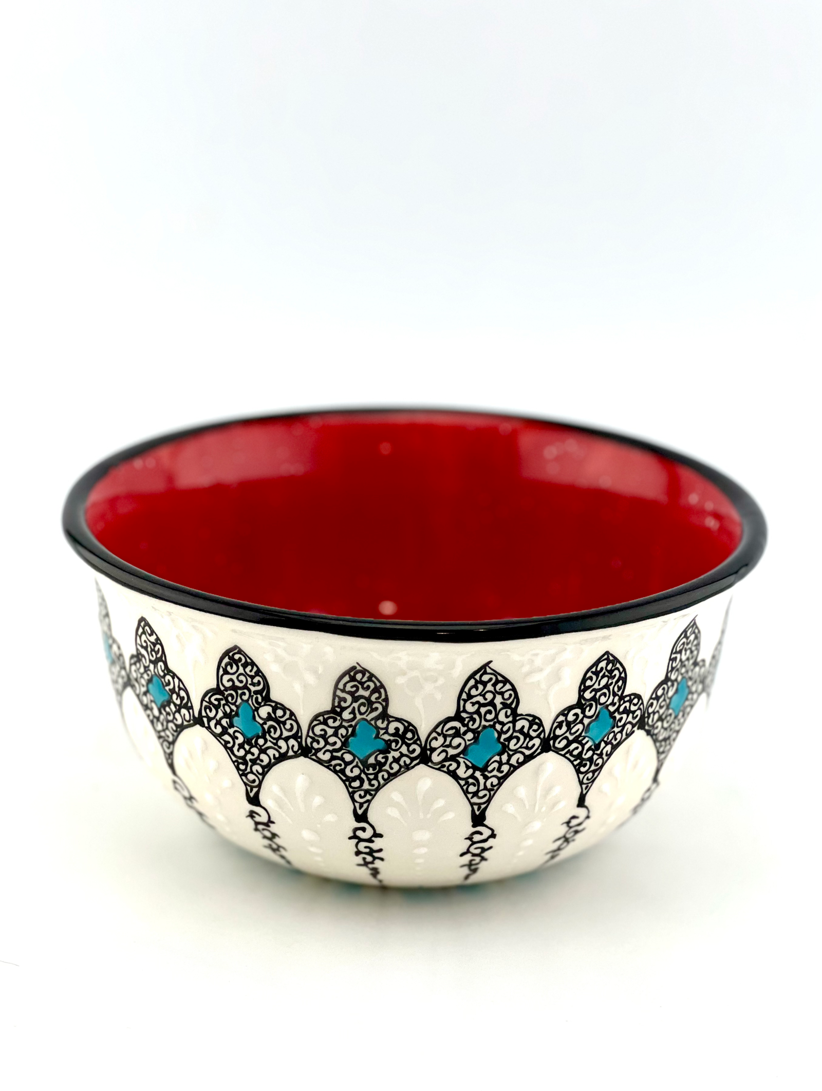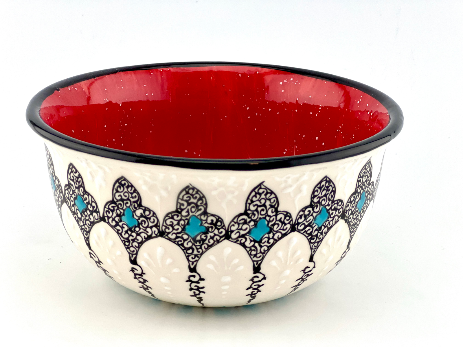 Hand-designed and glazed ceramic bowl in Traditional design.  It is dishwasher safe and microwave safe. One of a kind and signed on the bottom by the artist. Perfect gift for every new house and a great gift for your wife when you want to surprise them on your anniversary and you can also personalize your gifts.7”W …. 3.5H