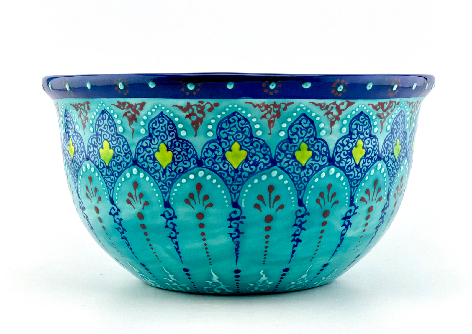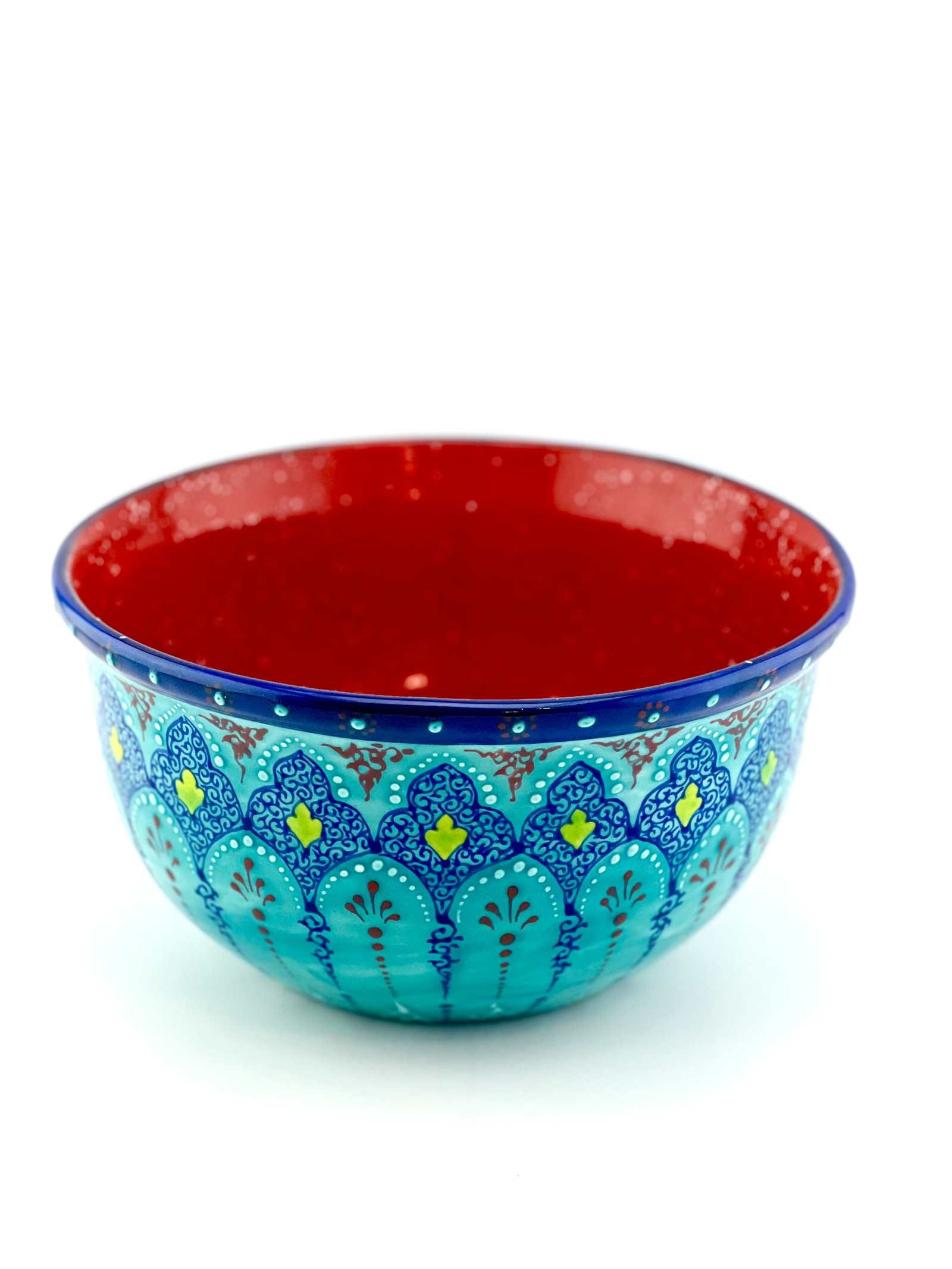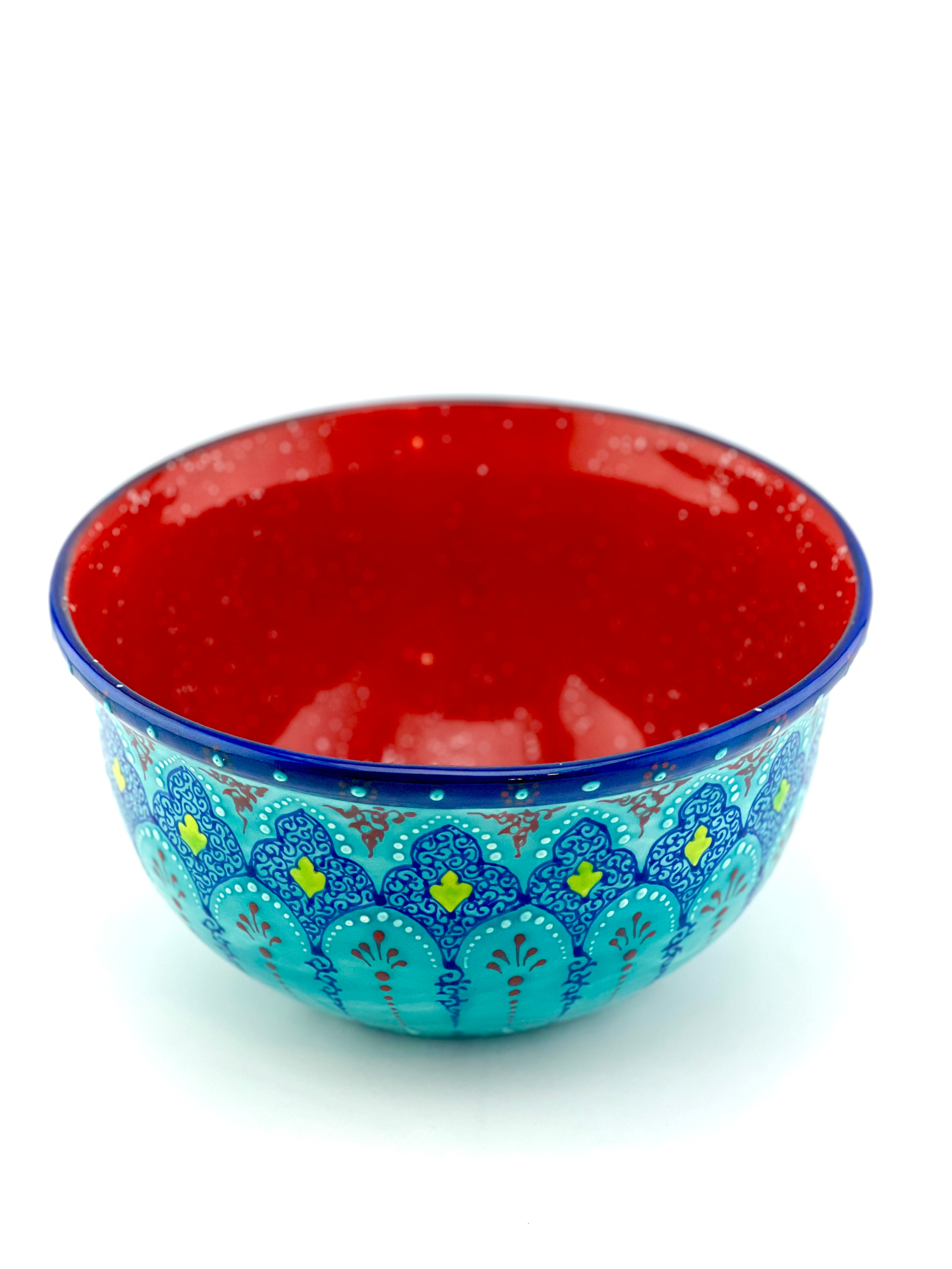 Hand-designed and glazed ceramic bowl in Turquoise Traditional design. It is dishwasher safe and microwave safe. One of a kind and signed on the bottom by the artist. Perfect gift for every new house and a great gift for your wife when you want to surprise them on your anniversary and you can also personalize your gifts. best center piece for you dinning table. Red glaze inside.