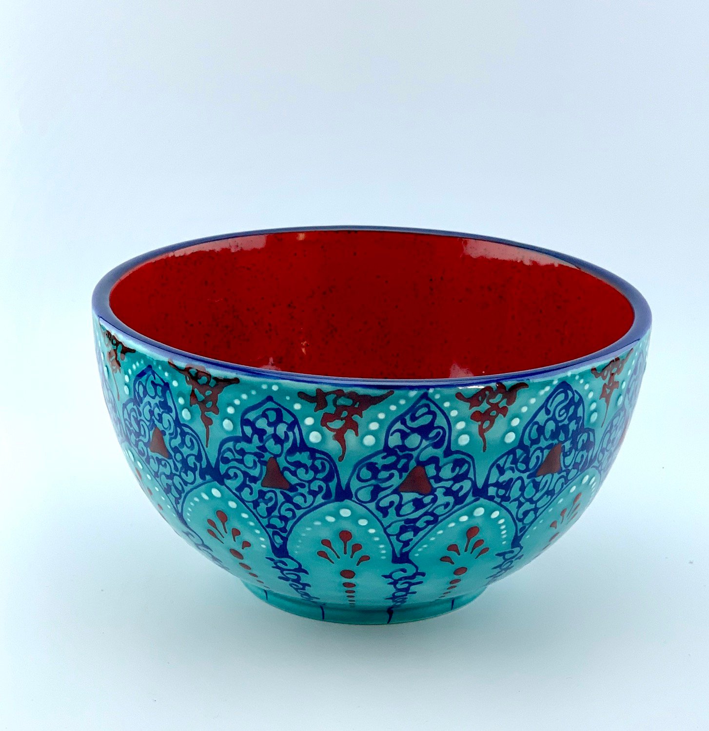 green treditional design Bowl. hand designed. dishwasher and microwave safe. one of a kind. 7 1/4″ Dia. x 4″ HVolume: 1 1/2 Liters