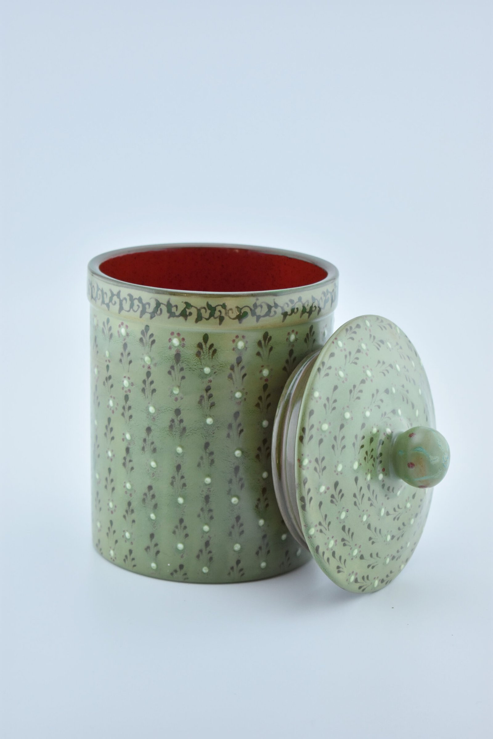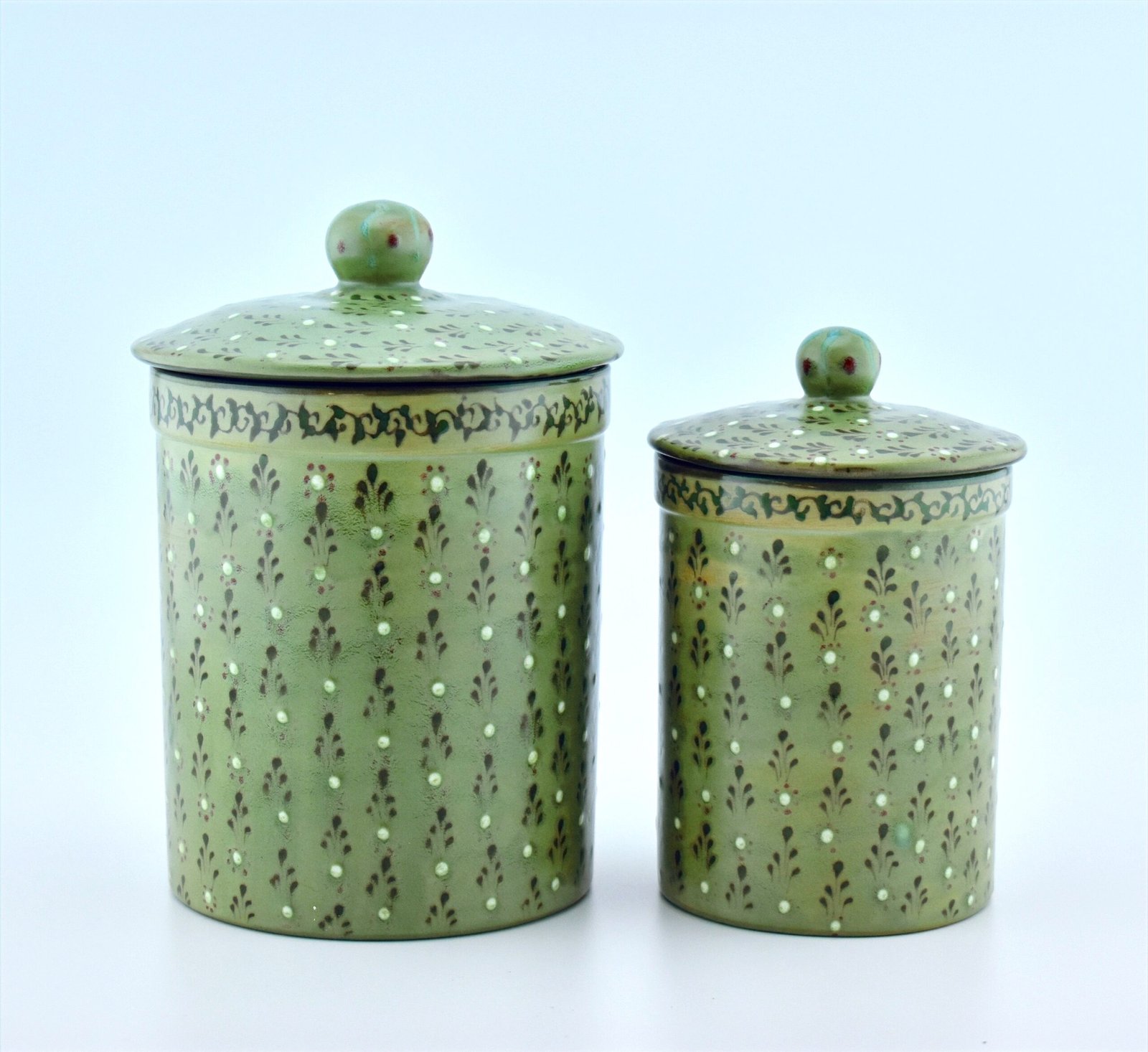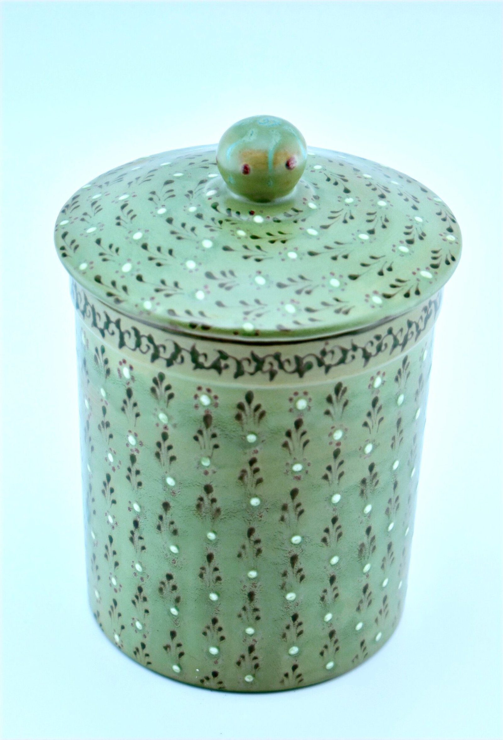 Designed in our traditional style. and Glazed in nature Green color. all Freehand. Dishwasher and microwave safe. one of a kind. Medium Canister with SealCanisters can be used in the kitchen, bathroom or even in the laundry room.7½” H x 5″ Dia. (38 Ounces)you can order as a set. just email Us.