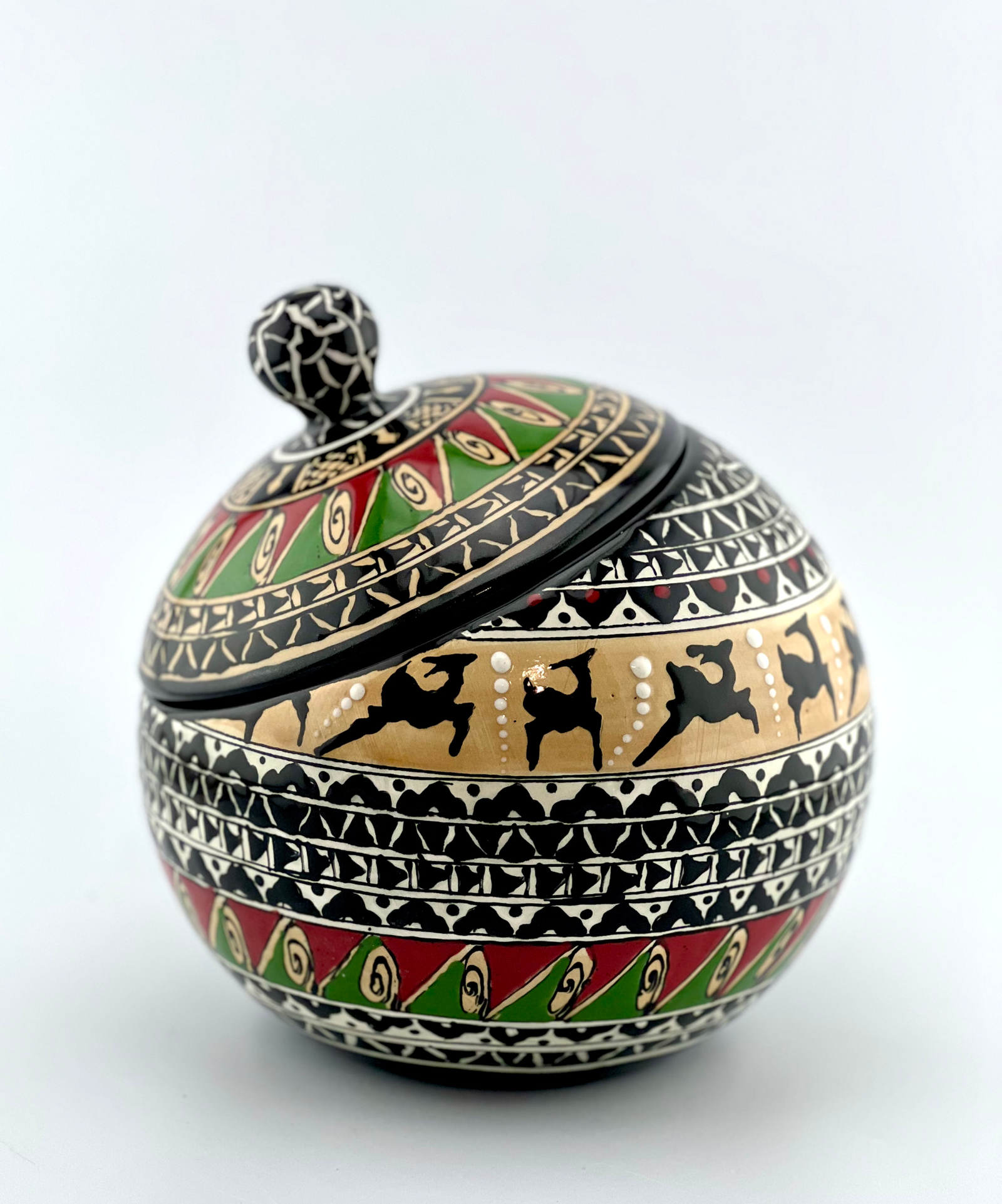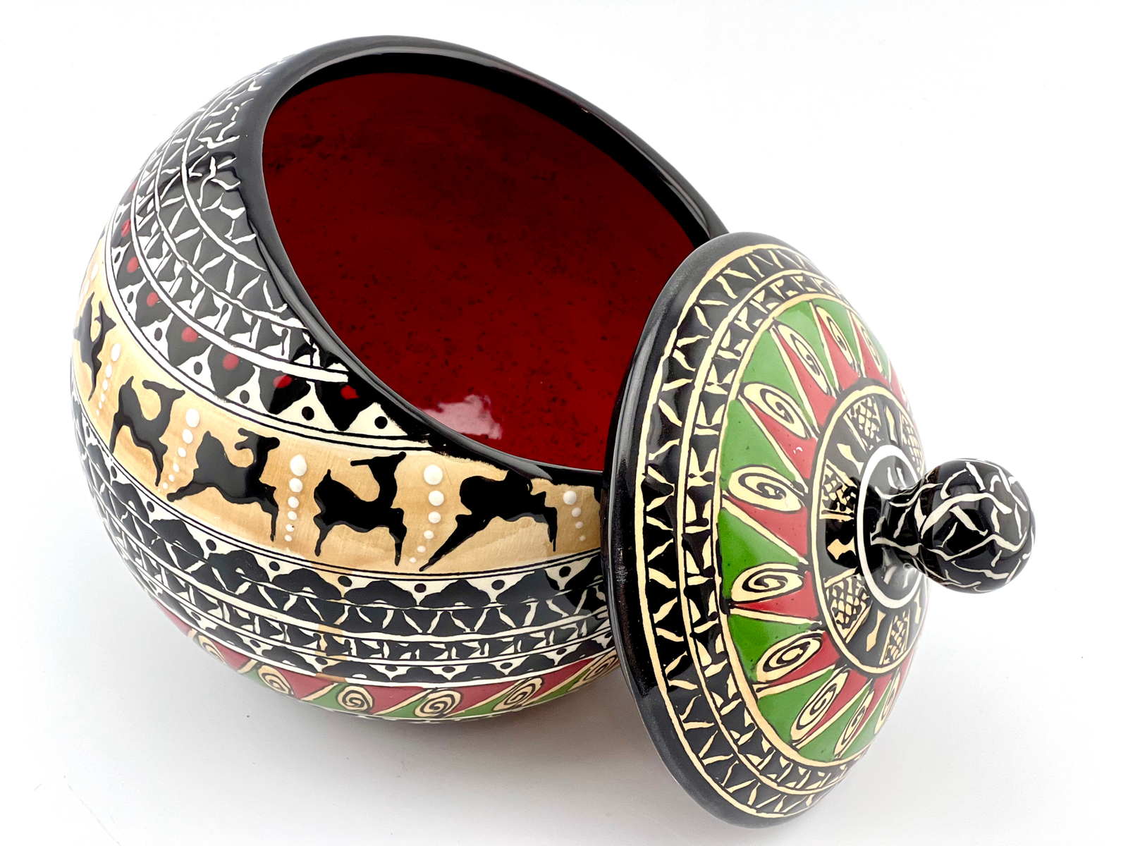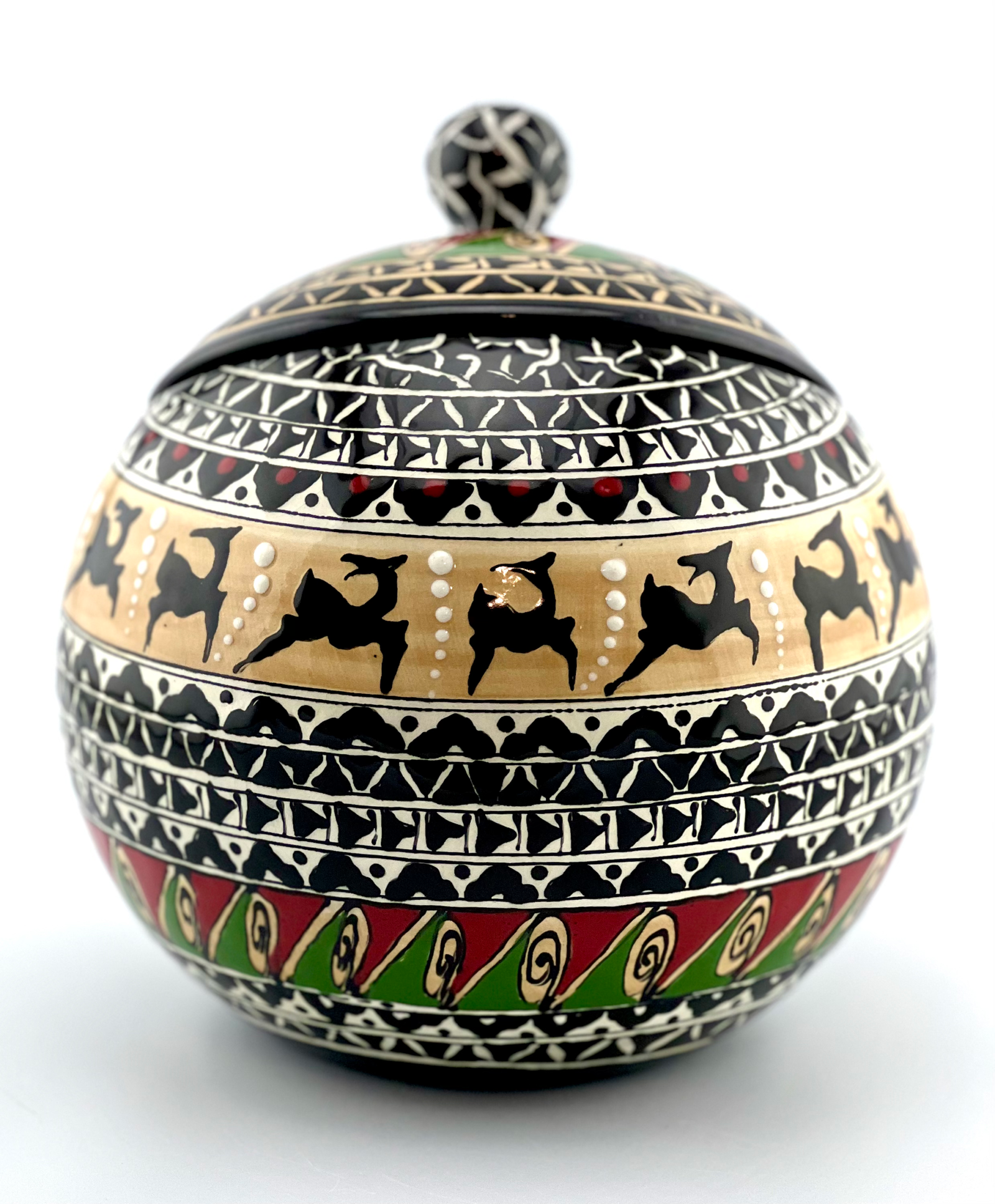 Hand designed and glazed Cookie jar in black-and-white and historical design. red glaze inside. all freehand dishwasher safe and microwave safe. combination of black and white with a touch of red is the best color balance ever . best gift for yourself and all your beloved ones for your Cookie times. you can use it for your tea bags or any thing that you want. This design has a really strong character. This unique ceramic shape will keep your cookies fresh in style.