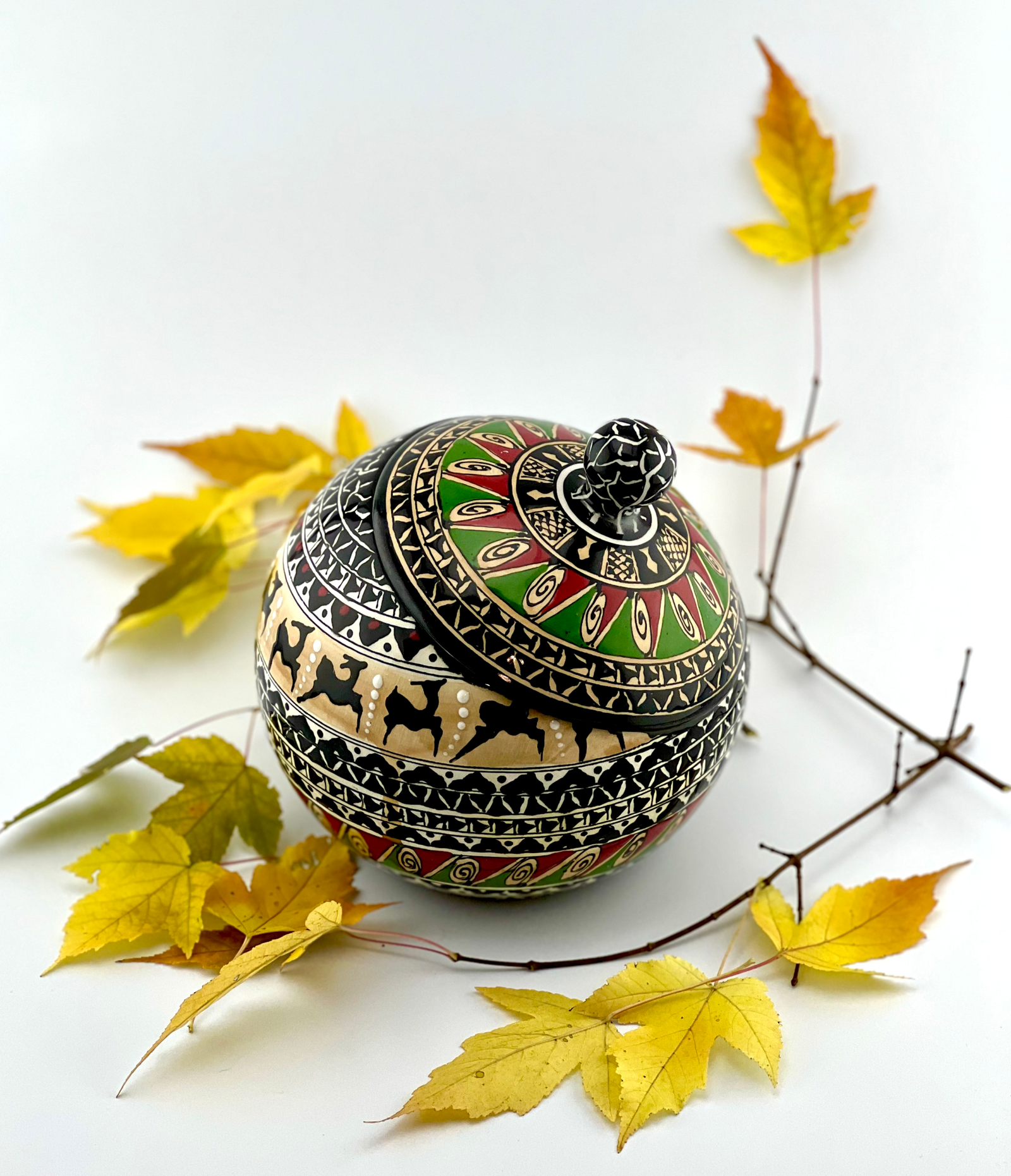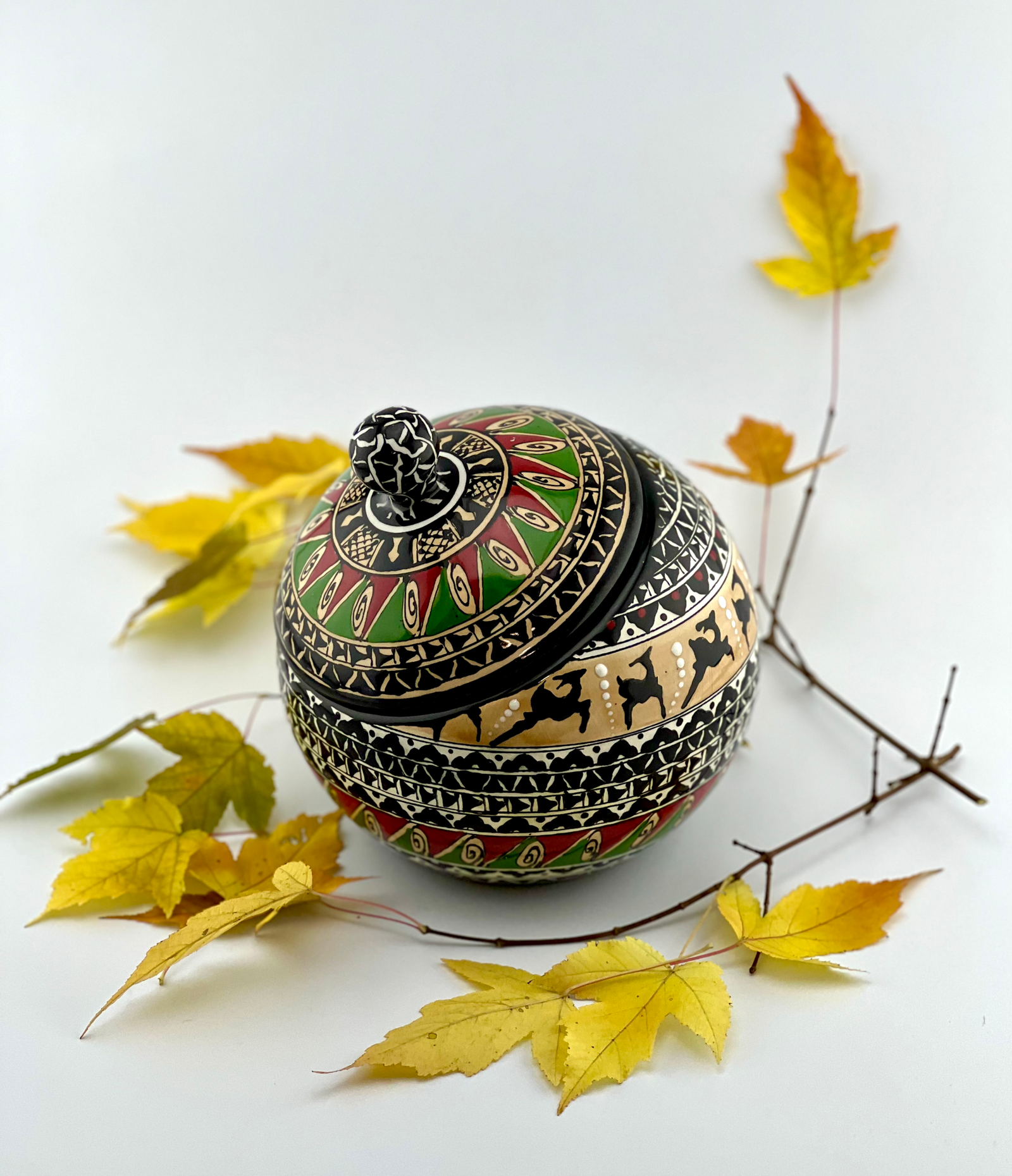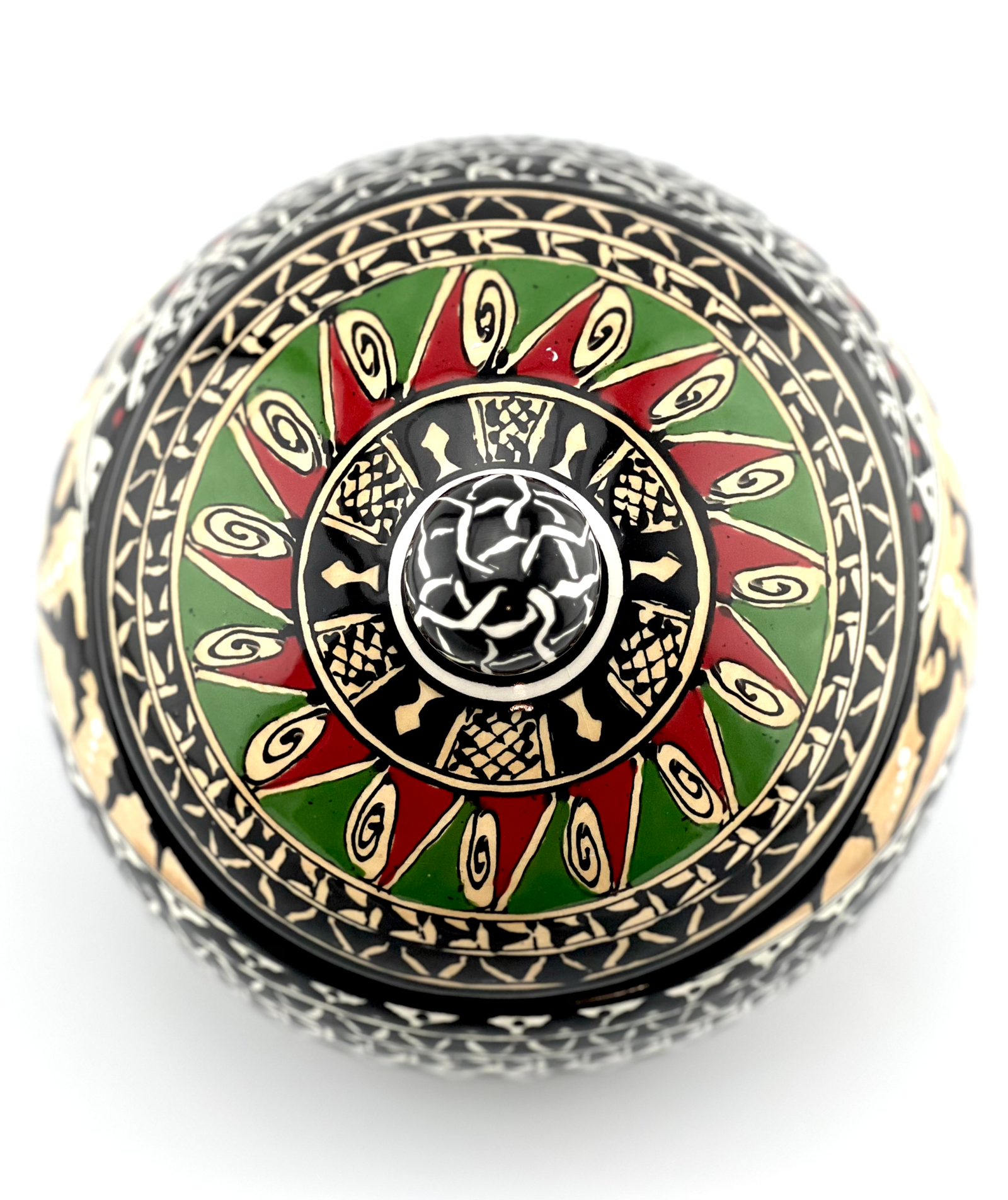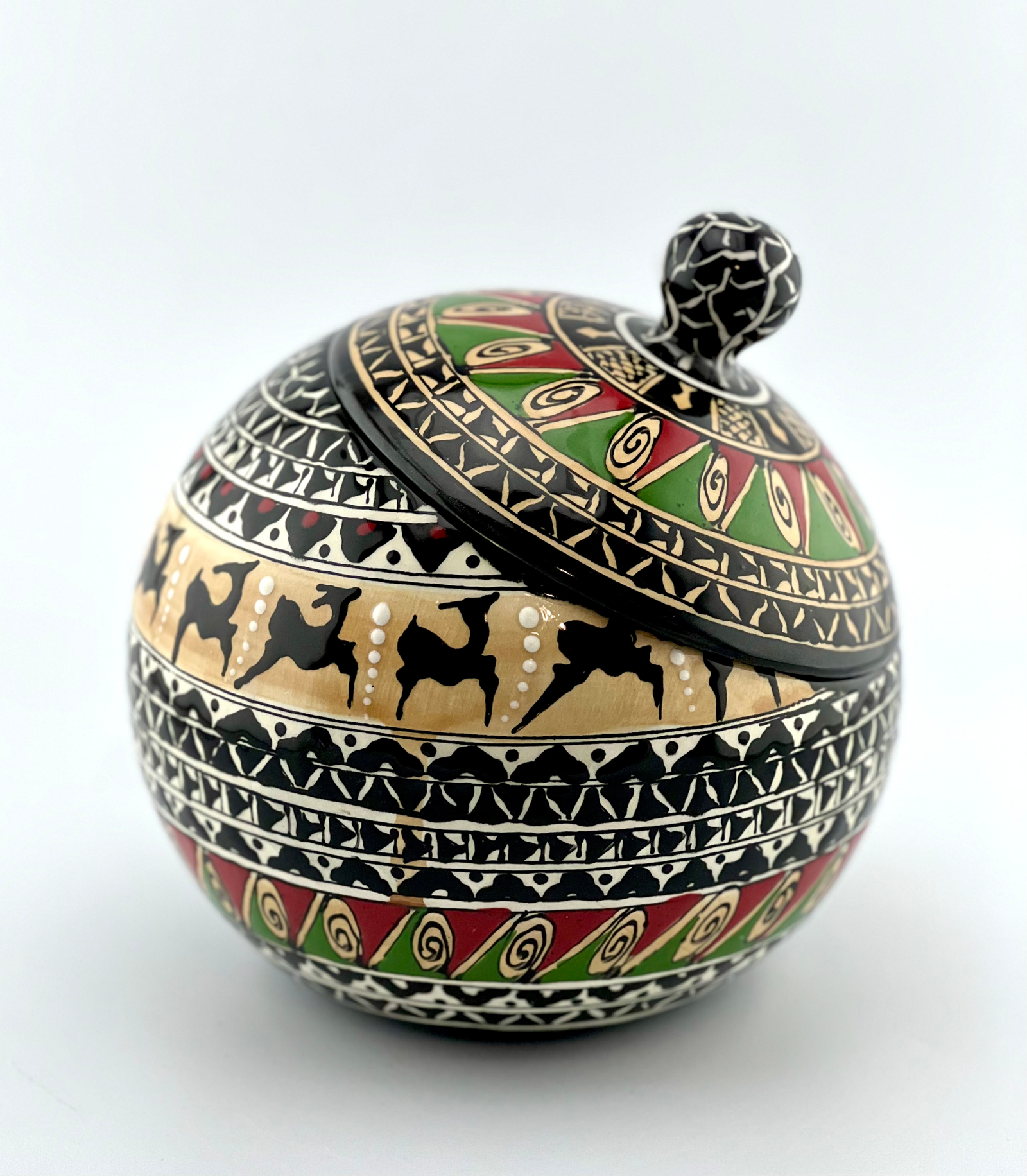 Hand designed and glazed Cookie jar in black-and-white and historical design. red glaze inside. all freehand dishwasher safe and microwave safe. combination of black and white with a touch of red is the best color balance ever . best gift for yourself and all your beloved ones for your Cookie times. you can use it for your tea bags or any thing that you want. This design has a really strong character. This unique ceramic shape will keep your cookies fresh in style.