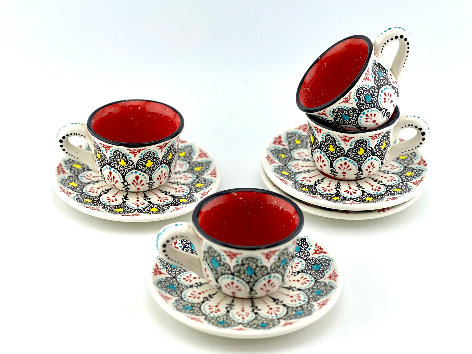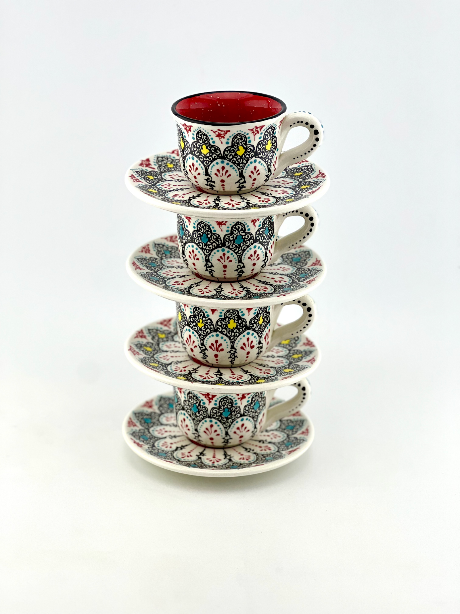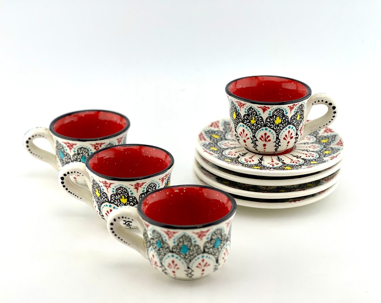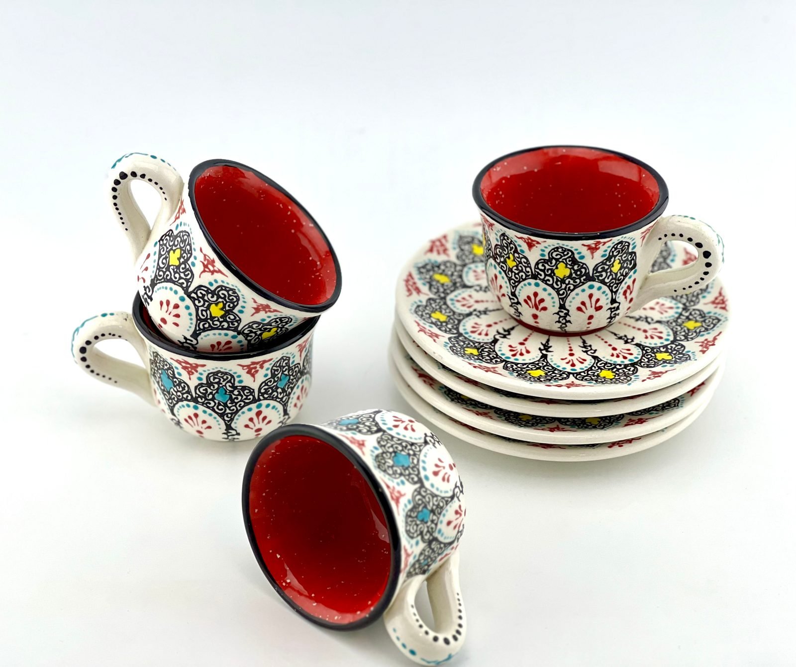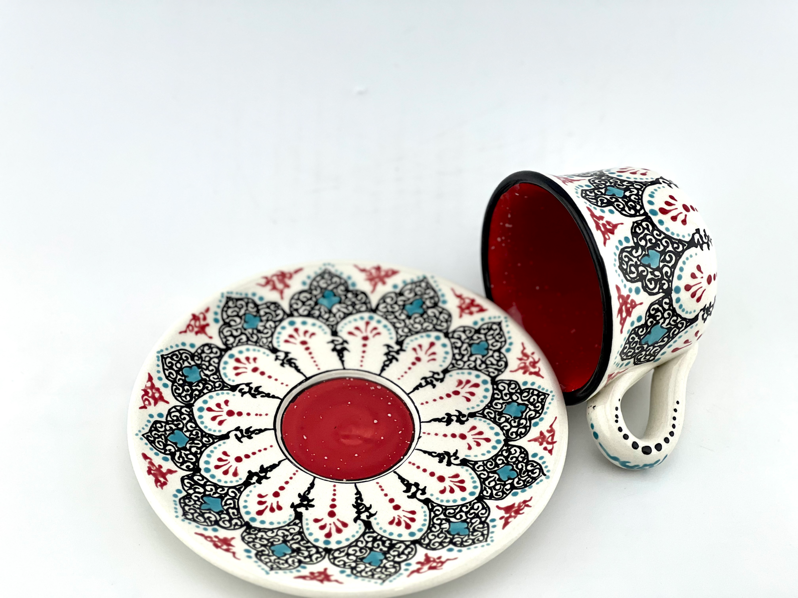 Hand designed and glazed Espresso Cup and Saucer in traditional design. red glaze inside. all freehand dishwasher safe and microwave safe. best gift for yourself and all your beloved ones for your Espresso times. This design has a really strong character.