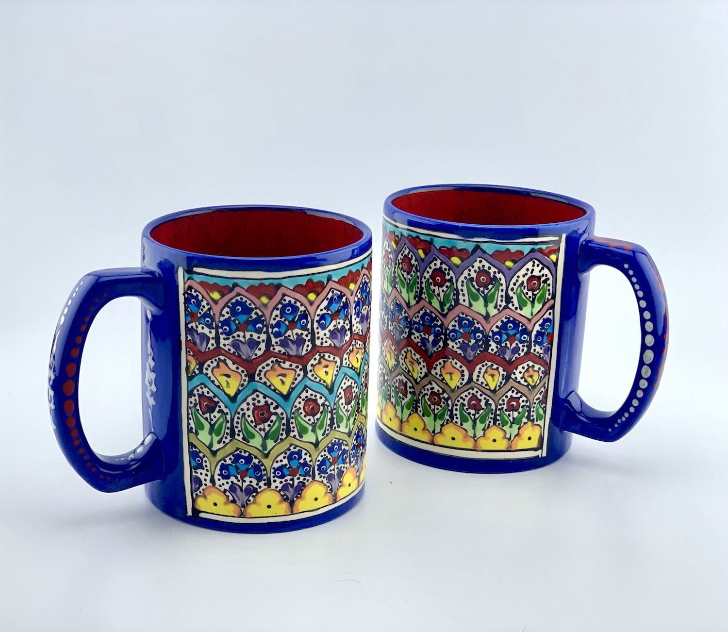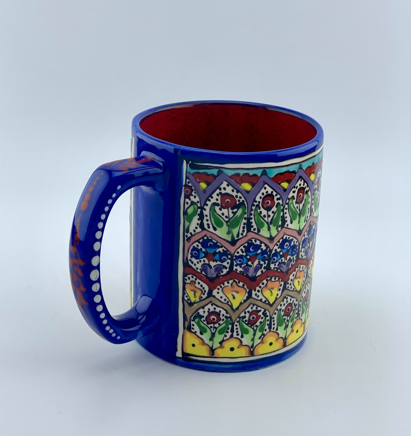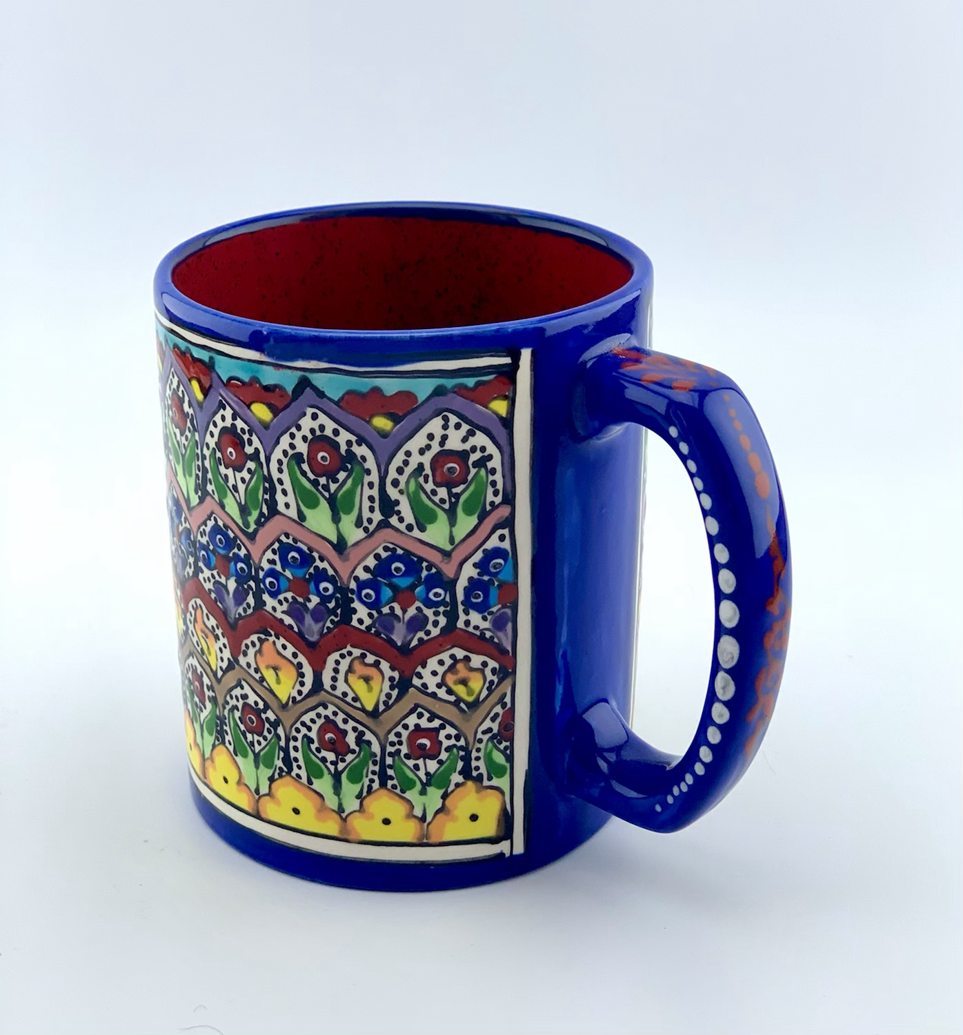 Hand painted and glazed Mug in garden design . Great Gift four large coffee mug lowers. This shape is great for a beer.  Great gift for all classy dad and classy man. Perfect gift for your coworkers and managers. Dishwasher safe and microwave safe and one of a kind.4″ Dia. x 4⅞” H (24 Ounces)