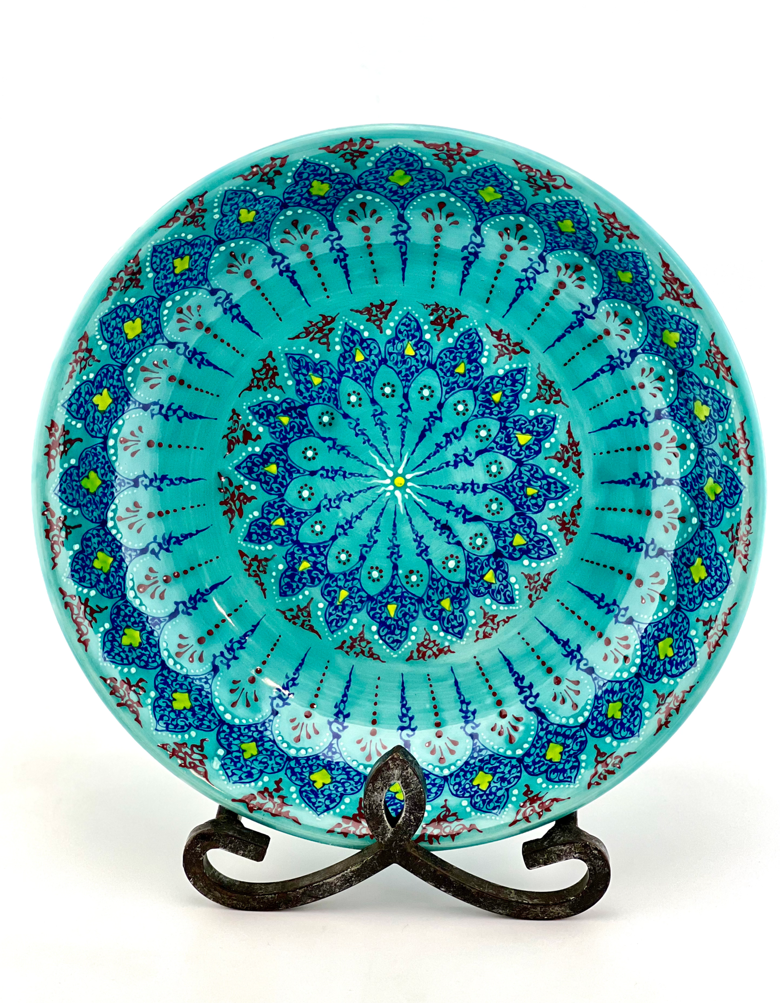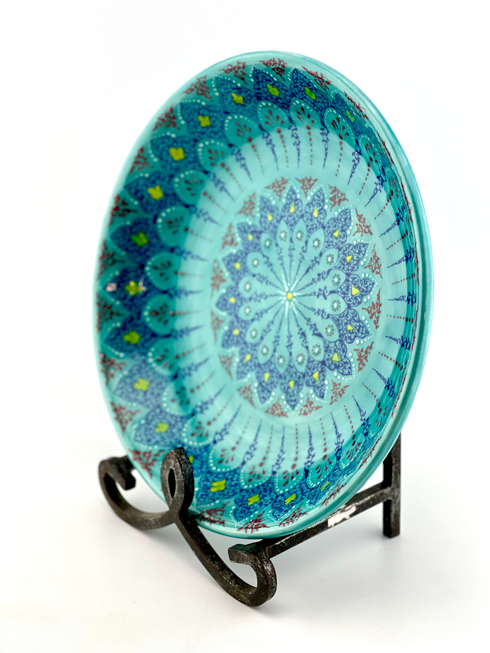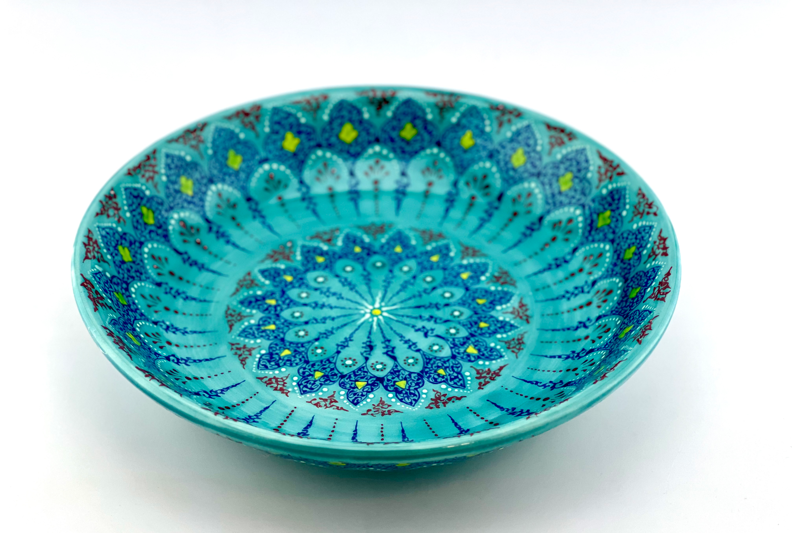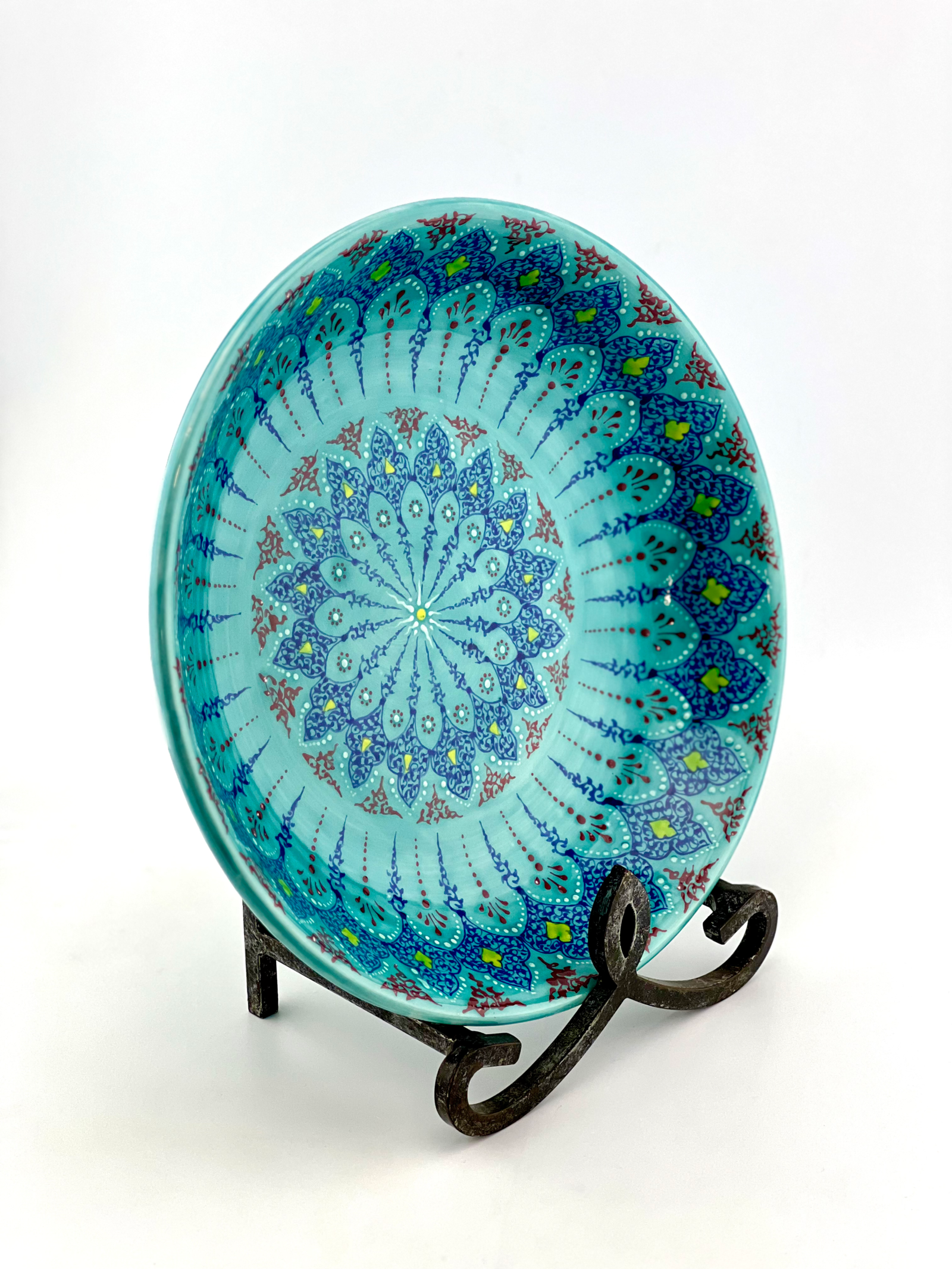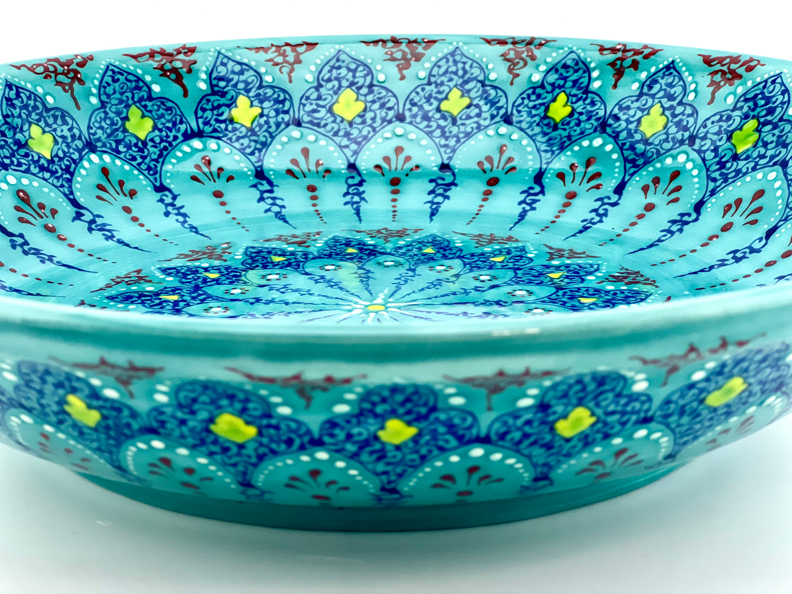 Hand-designed and glazed ceramic bowl in Turquoise Traditional design.  It is dishwasher safe and microwave safe. One of a kind and signed on the bottom by the artist. Perfect gift for every new house and a great gift for your wife when you want to surprise them on your anniversary and you can also personalize your gifts. 12½” Dia. x 3″ H