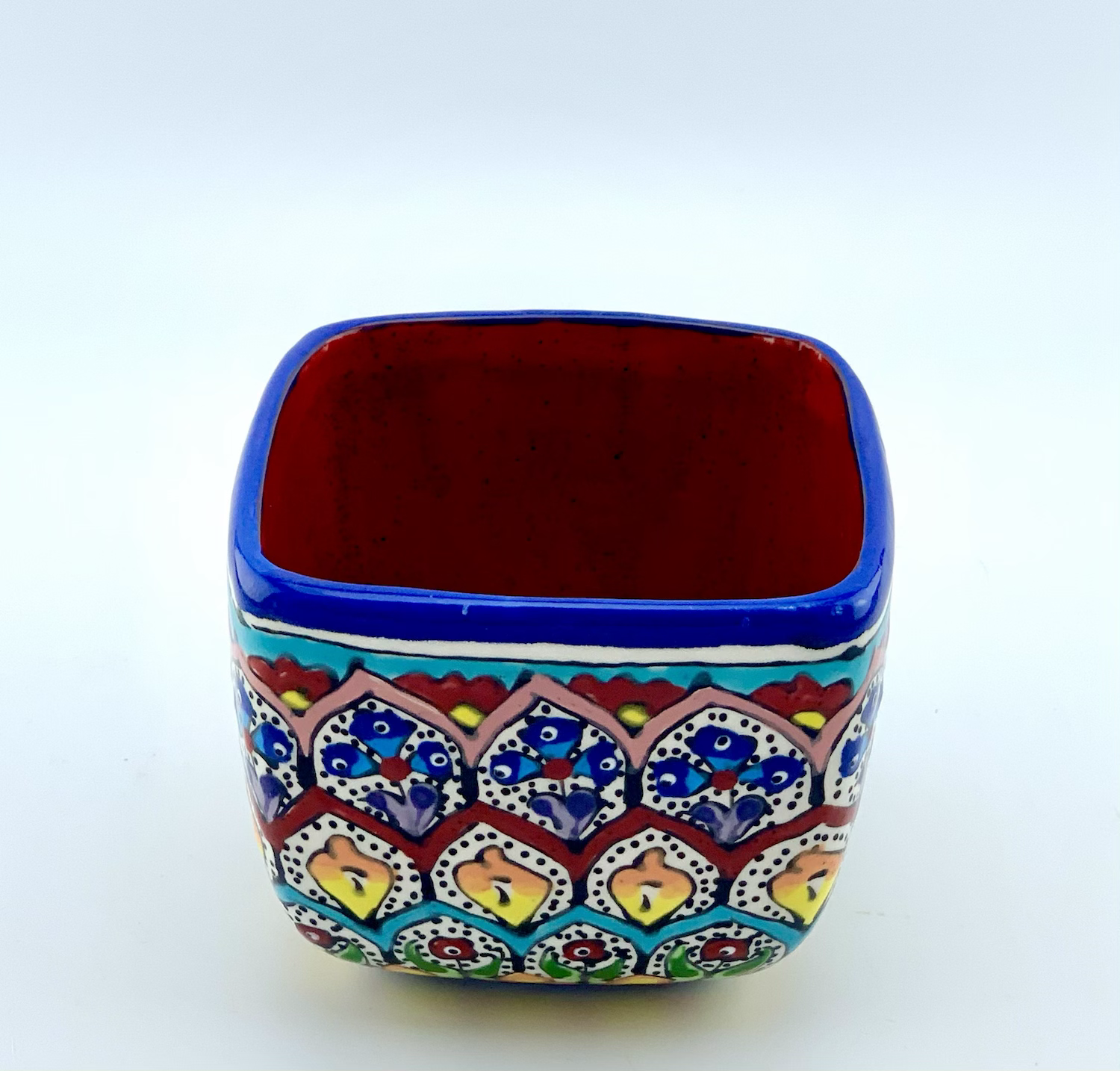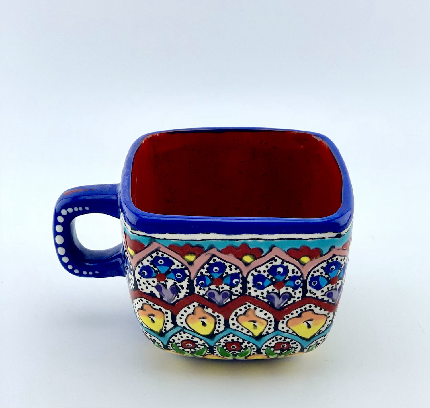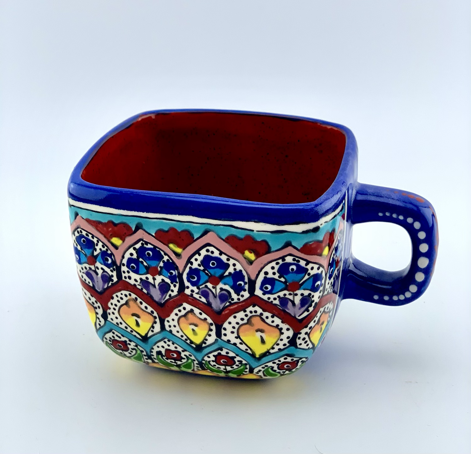 Hand designed and glazed mug in garden design. all freehand, dishwasher safe and microwave safe. this unique mug is going to be your friend for every boring day. All layers of different colors are going to cheer you up every day in your coffee time. Be happy in your coffee time. 4″ W x 4″ L x 3 ¼” HVolume: 16 ounce
