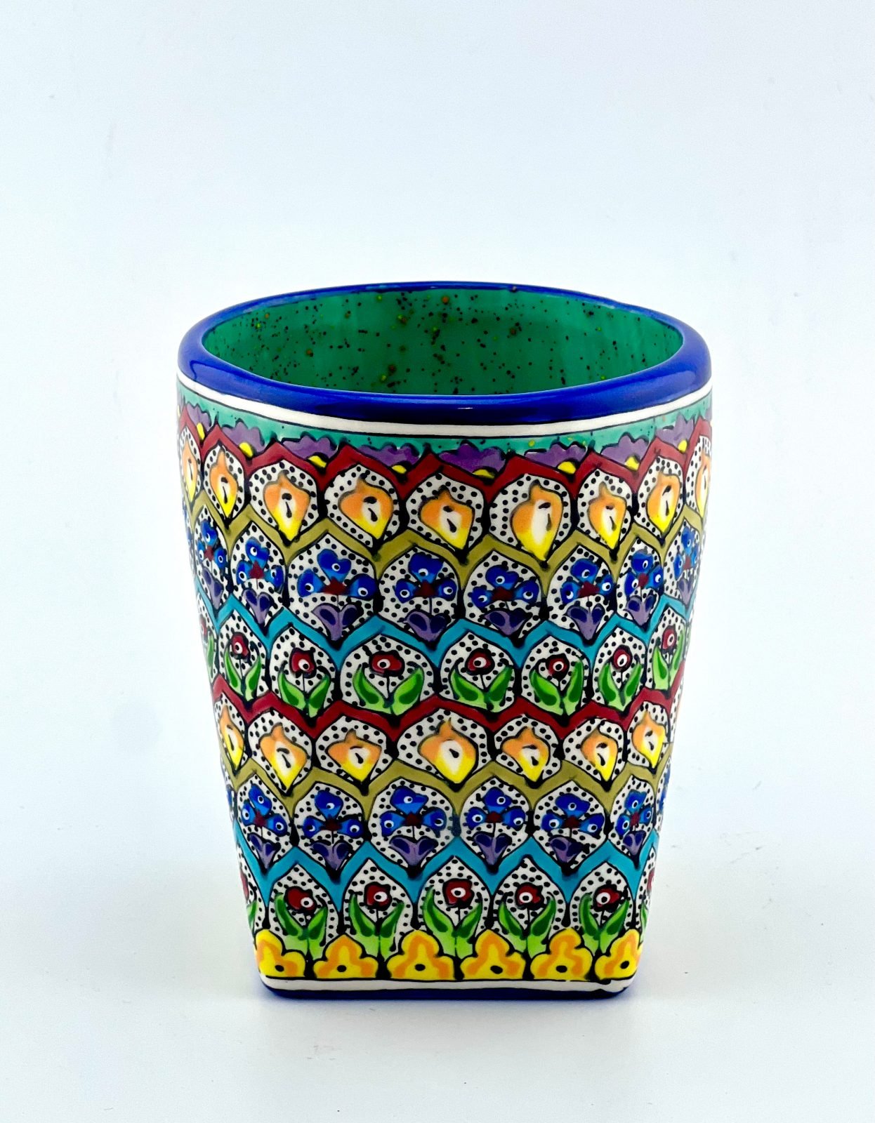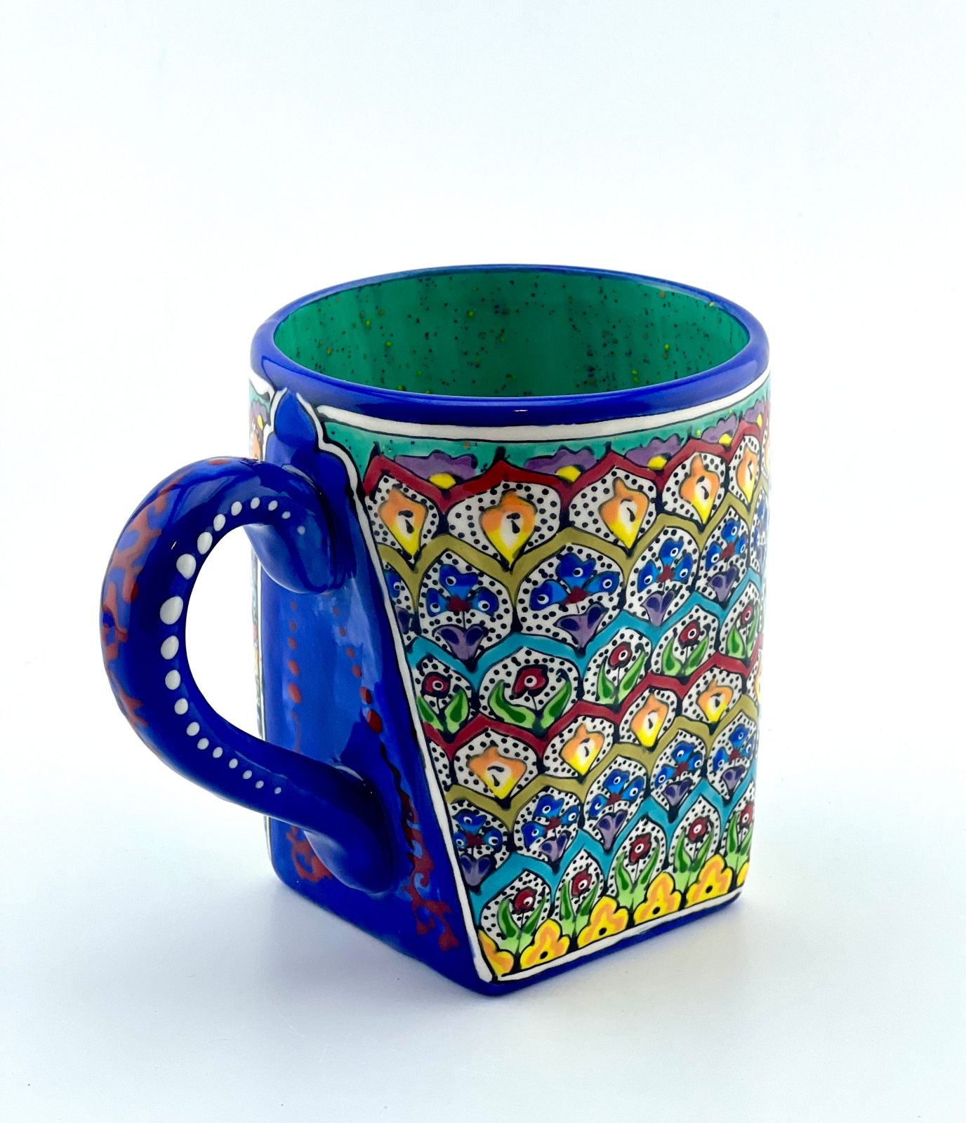 Hand-designed and glazed mug in Garden design. Turquoise glaze inside. all freehand dishwasher safe and microwave safe. Best gift for yourself and all your beloved ones for your coffee times. This design has a powerful character. It brings colors and happiness to your life. Great gift for your beloved ones.