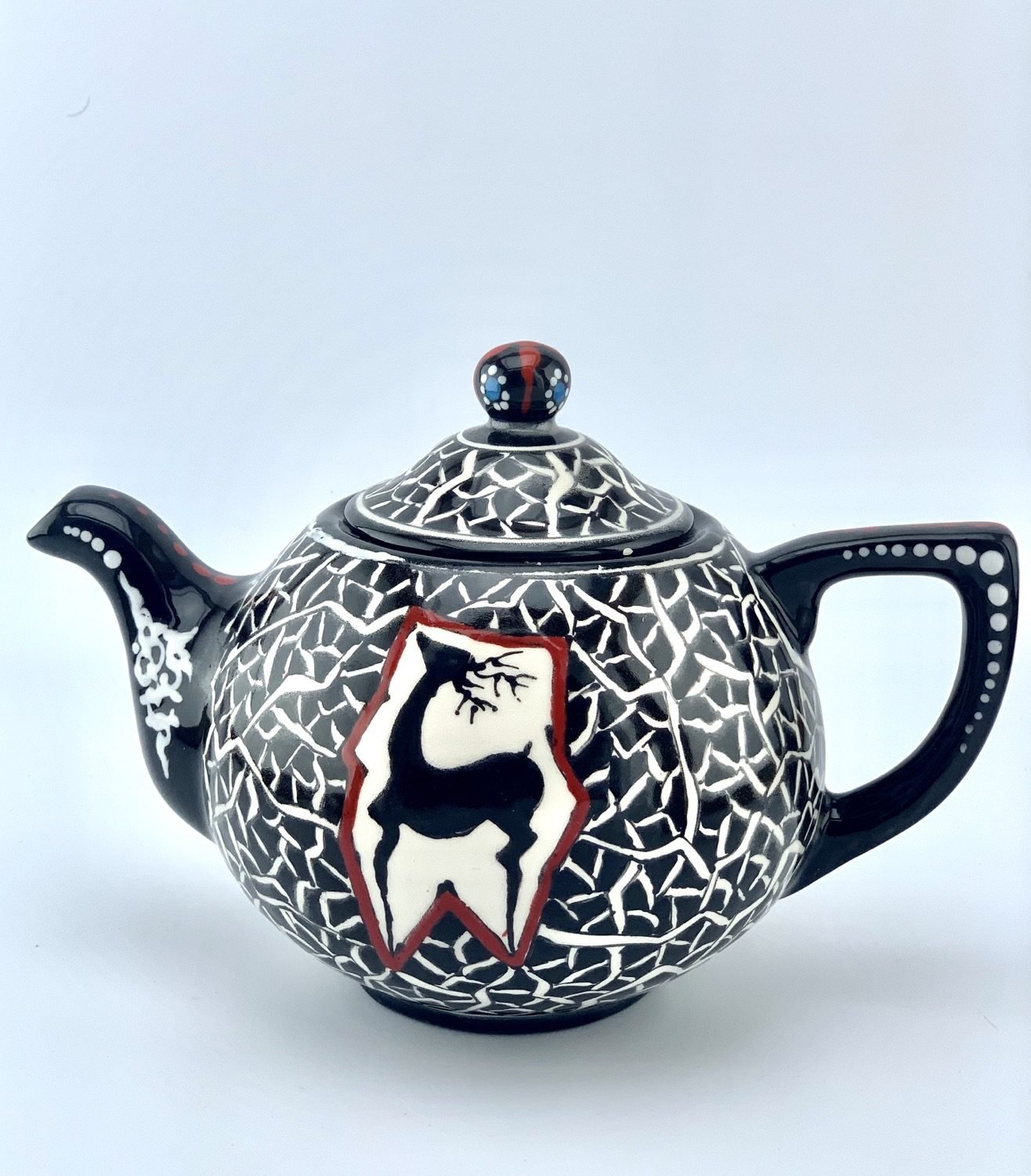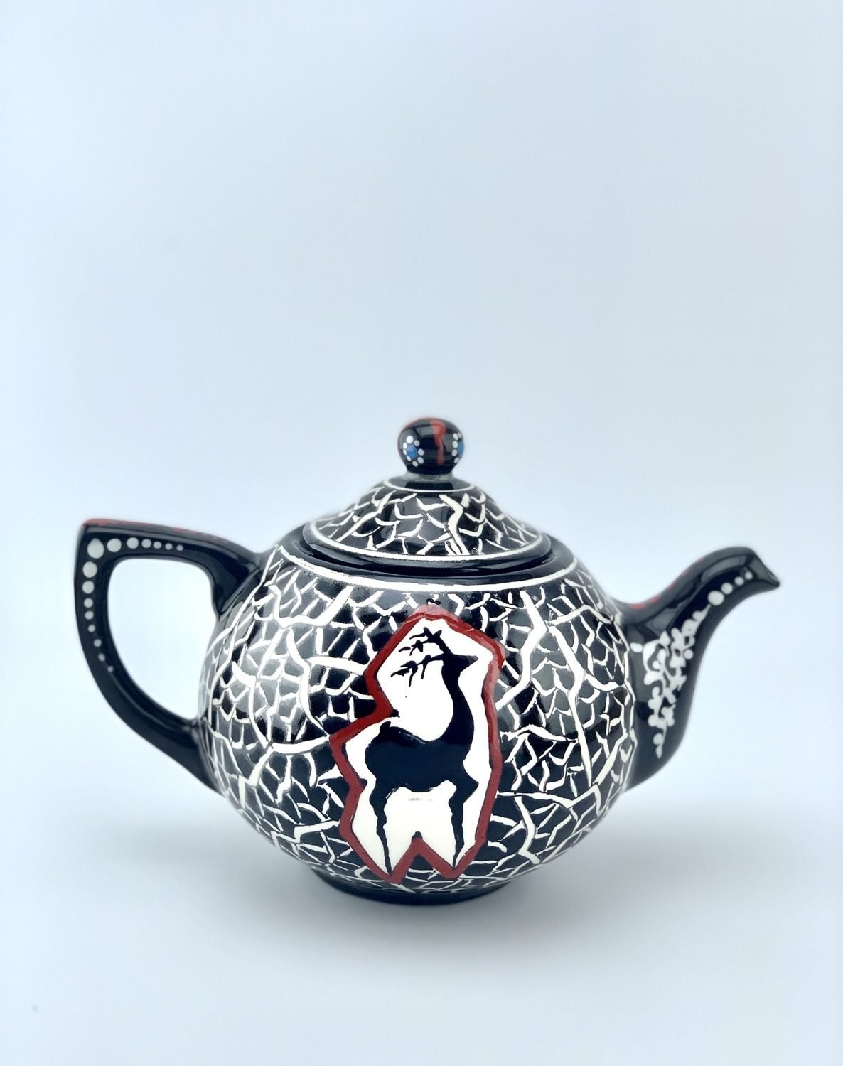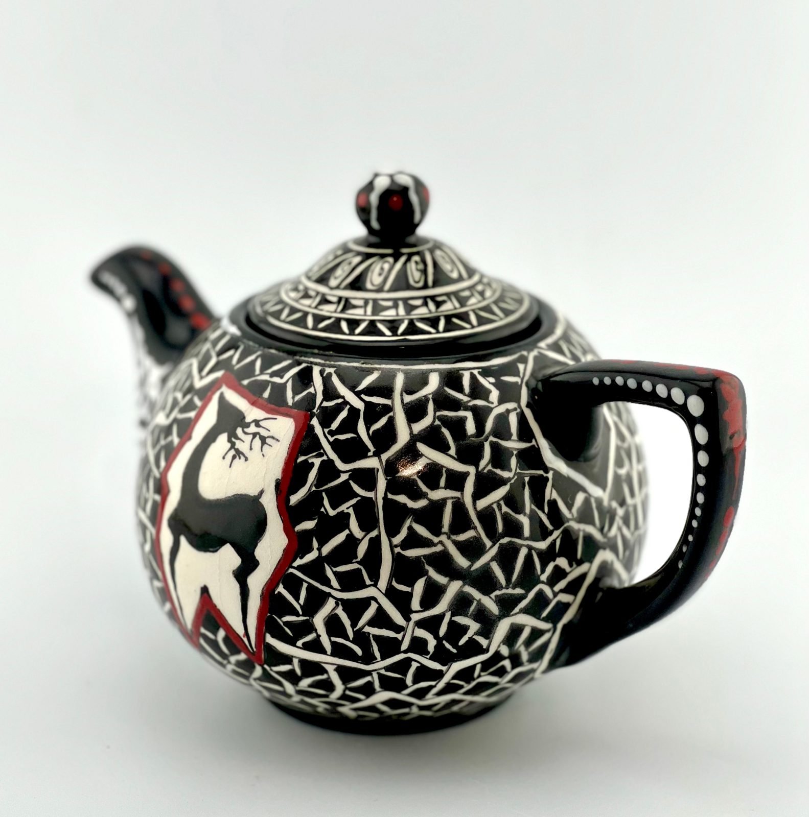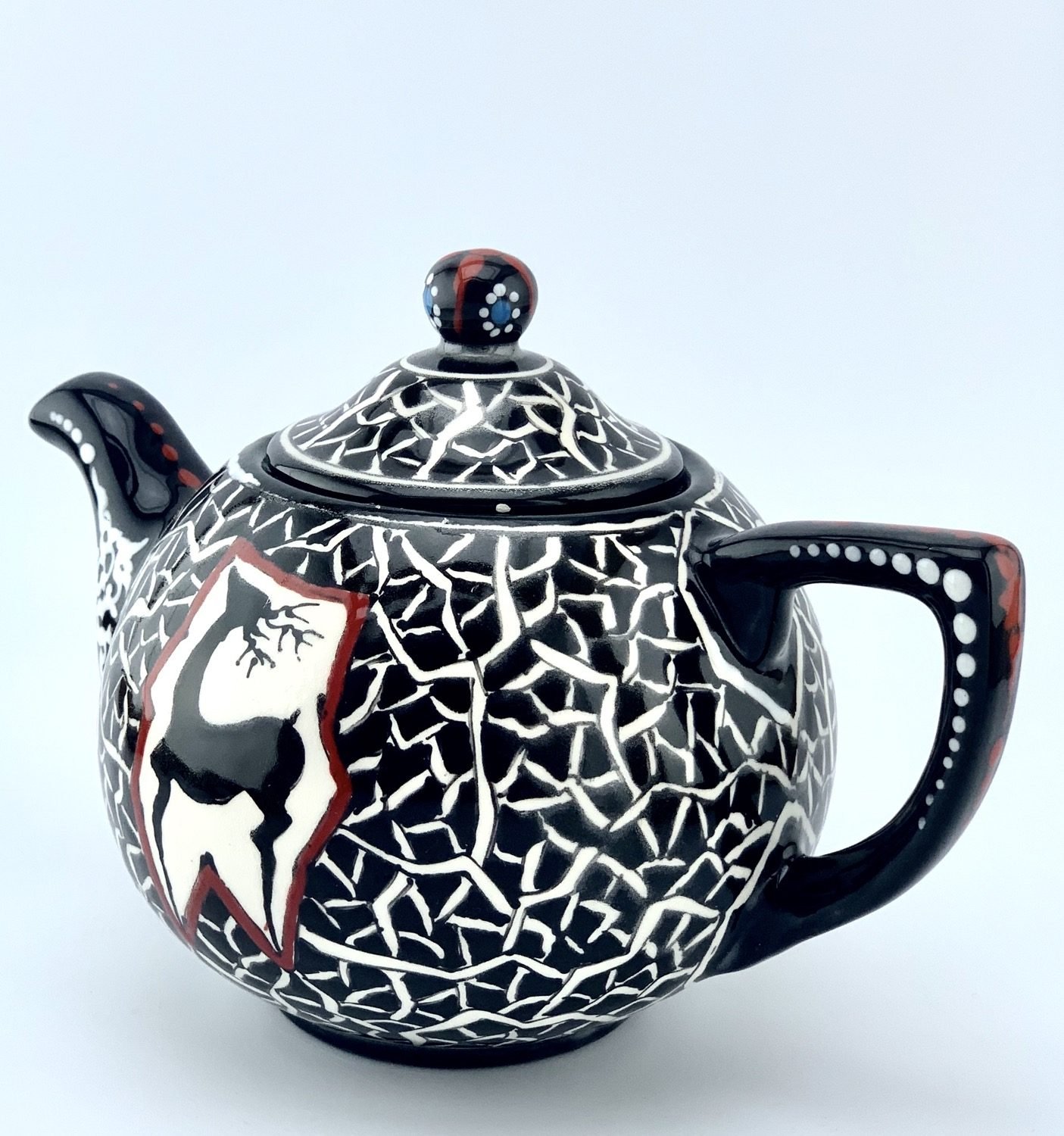 Hand painted and glazed teapot in black-and-white historical design. best gift for your mom. best gift for teapot collectors. one of a kind dishwasher safe and microwave safe.