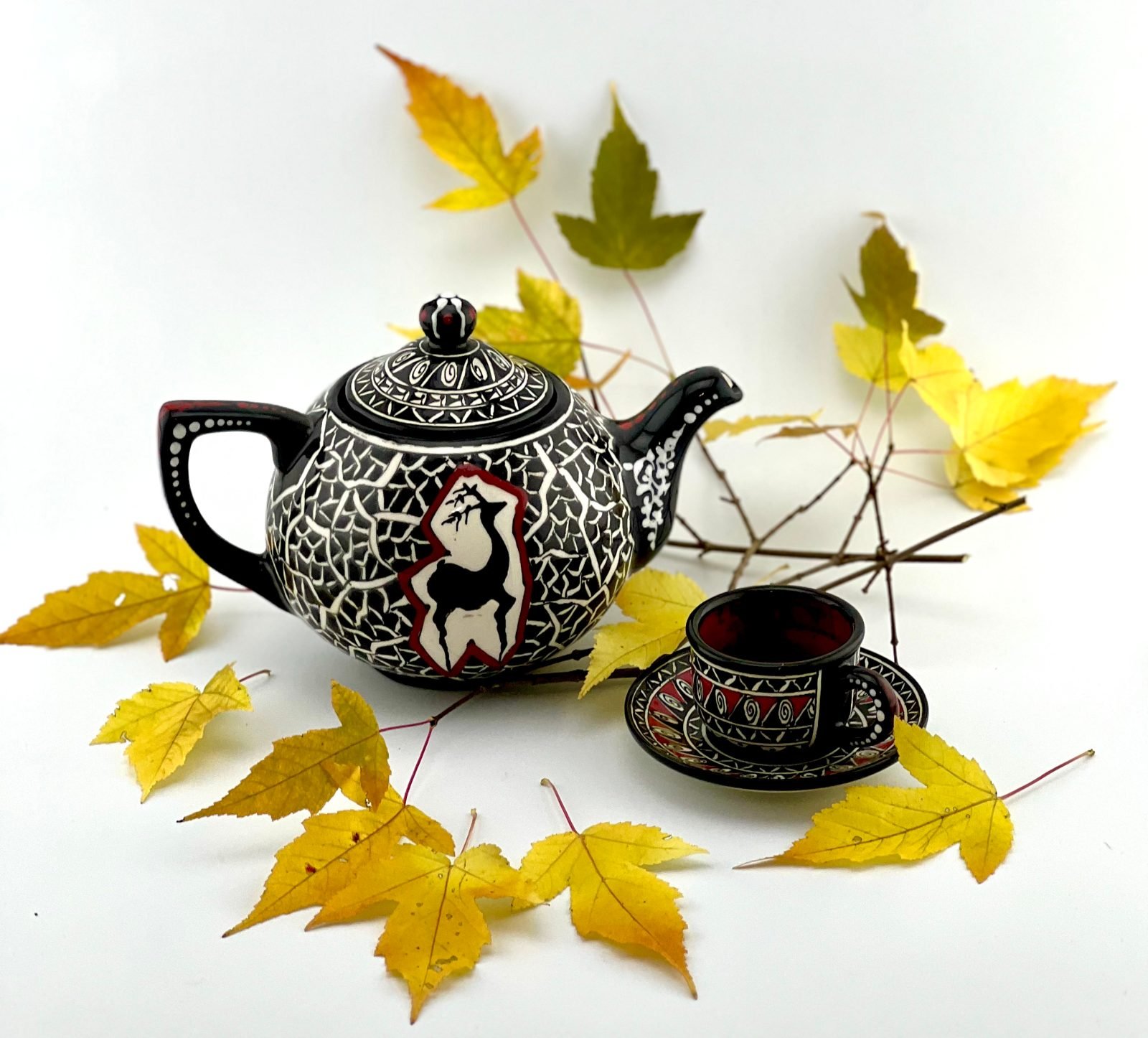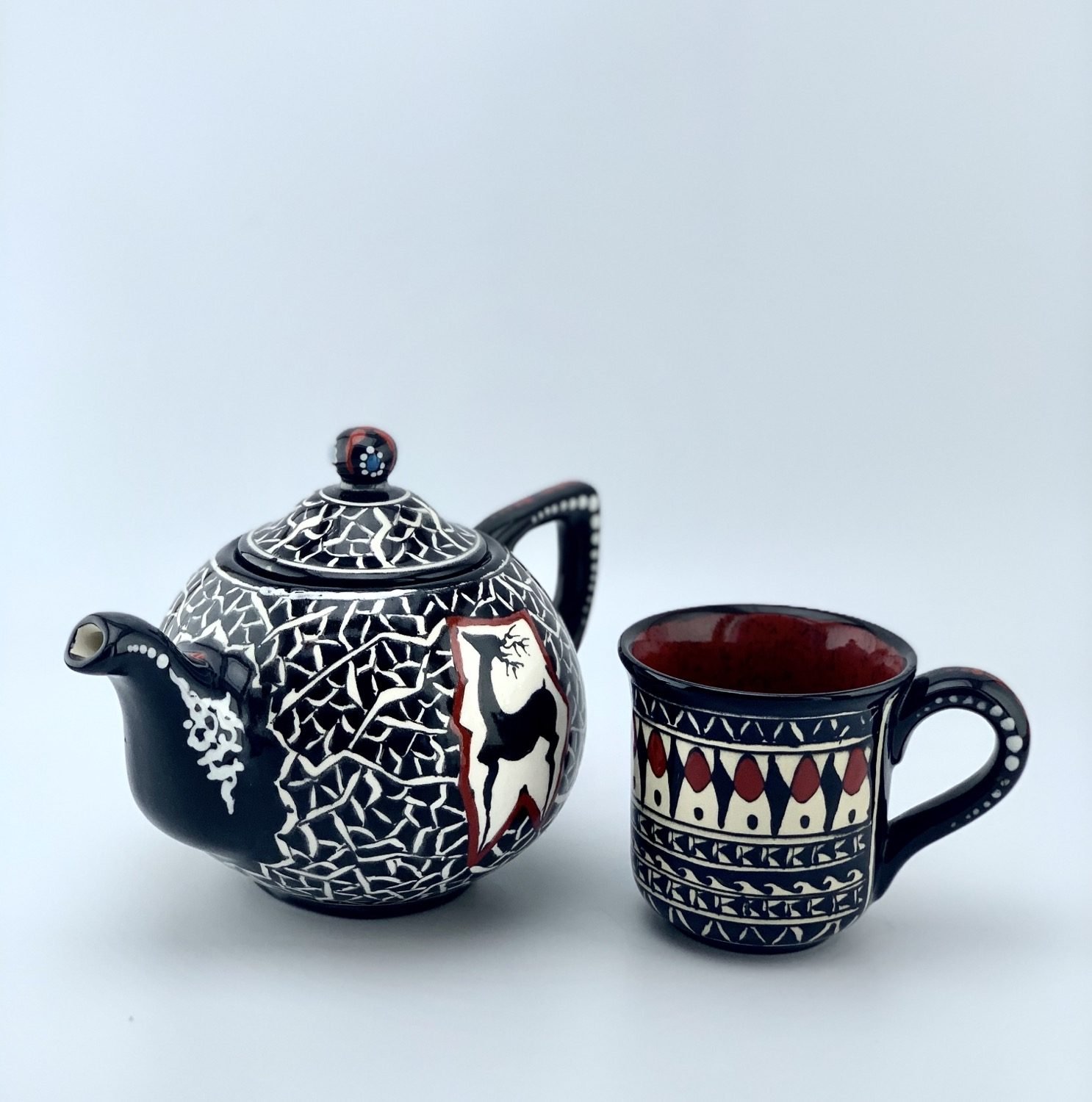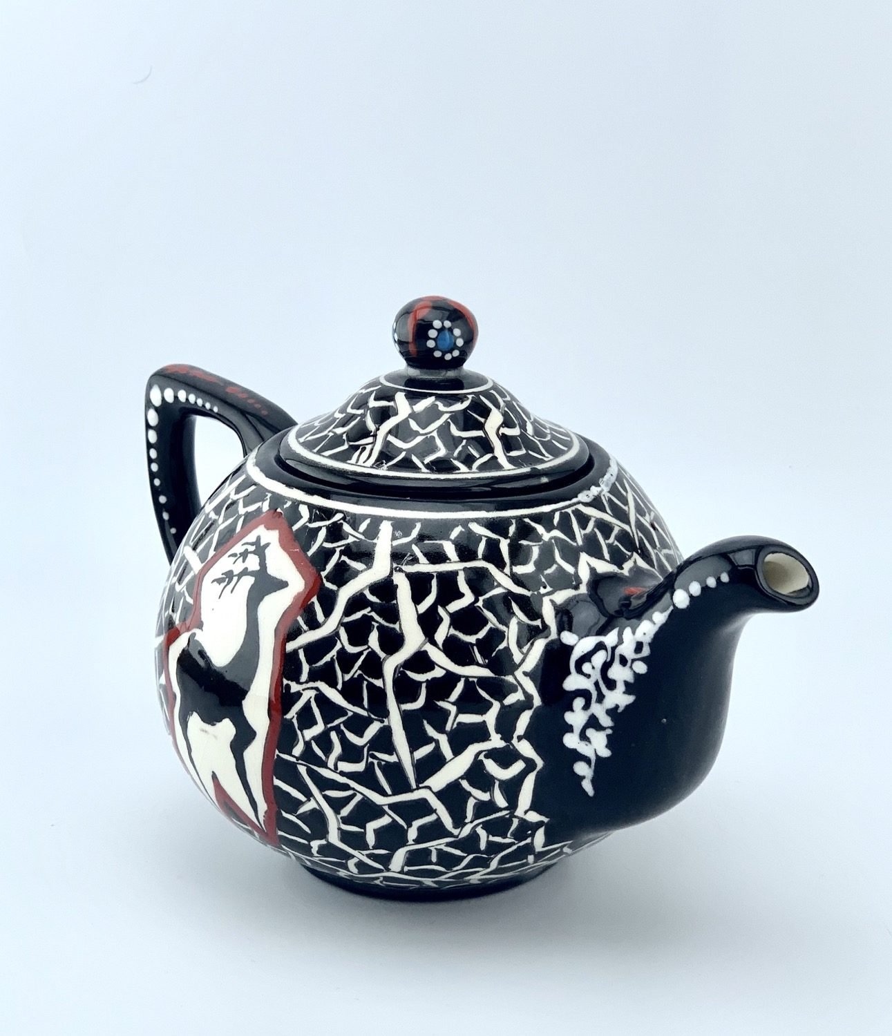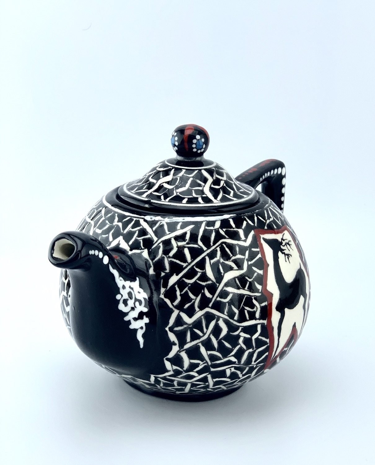 Hand painted and glazed teapot in black-and-white historical design. best gift for your mom. best gift for teapot collectors. one of a kind dishwasher safe and microwave safe.